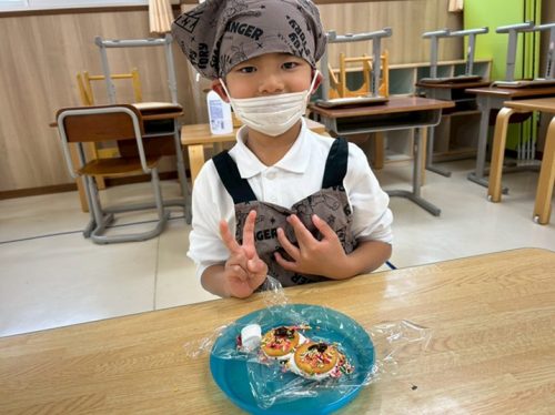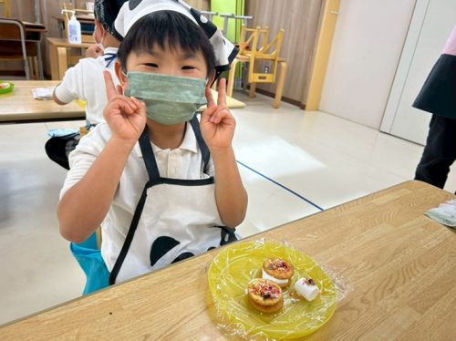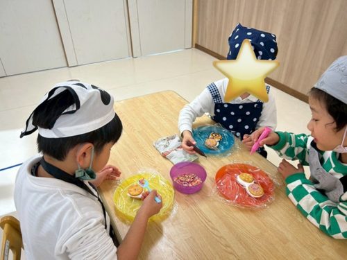 今回は、クッキングを行いました。 クッキングをすることを伝えると、目を輝かせながら、「何作るの?楽しみ!」と伝えてくれる様子が見られました。 クラッカーの上にマシュマロを置き、レンジで温めると、段々マシュマロがトロッと溶けていくため、その様子を興味津々に見つめる子どもたち! 溶けたマシュマロの上にさらにクラッカーを置いてサンドすると、クラッカーにカラースプレーやチョコペンでデコレーションをしています✨ 最後は完成したマシュマロサンドを美味しそうに頬張るぞうグループさんでした♪