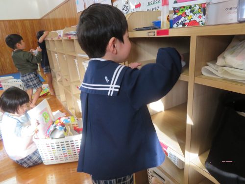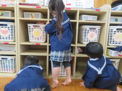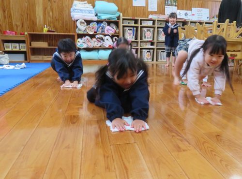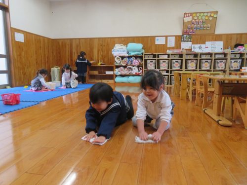 昨日は、自分たちの棚の拭き掃除と床の雑巾がけをしました。 棚掃除では、かごを移動させて棚に顔を入れて奥まで綺麗に拭いていきます。 また、床の雑巾がけでは何人かで並んで競争です! 雑巾がけの体勢はなかなか難しかったようで「あれ進まない?」「難しいな。」と苦戦する様子もありましたが、ゴールを目指して雑巾がけを行い部屋を綺麗にすることができました。