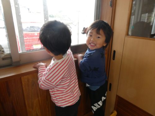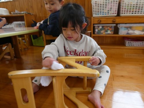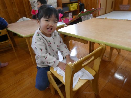 「ここもきれいにするの」と自分の椅子を一生懸命拭く子どもたちです!