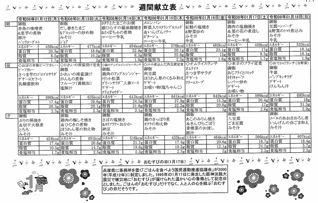 1月12日(月)~1月18日(日)の献立表になります。是非ご覧ください。
