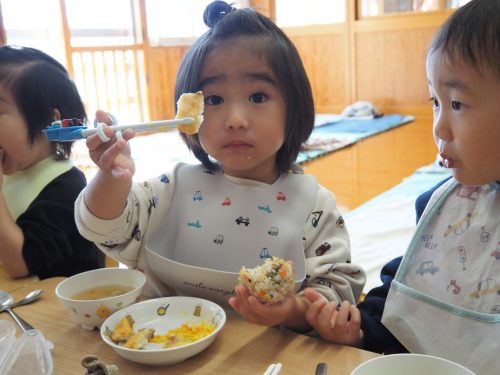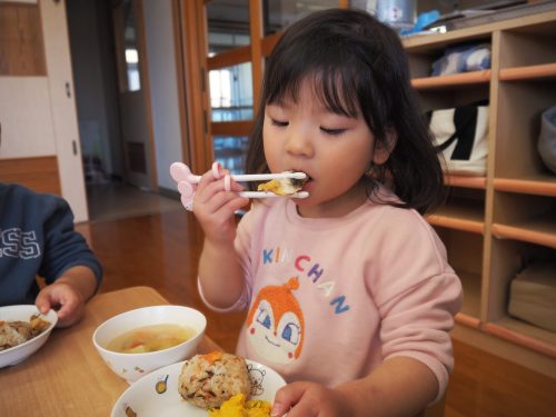 少しずつすくい持ちでスプーンを持つことが定着してきたり、箸で食べる子も増えてきたりと成長が多く見られてきました。進級に向けて残り3ヶ月も取り組んでいきたいと思います。