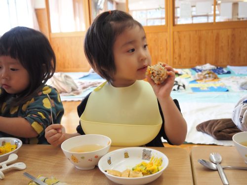 大好きなおにぎりは大きな口で食べ進め、苦手な野菜もあっという間に完食です。