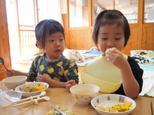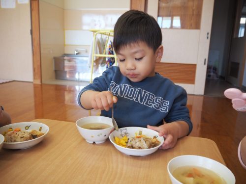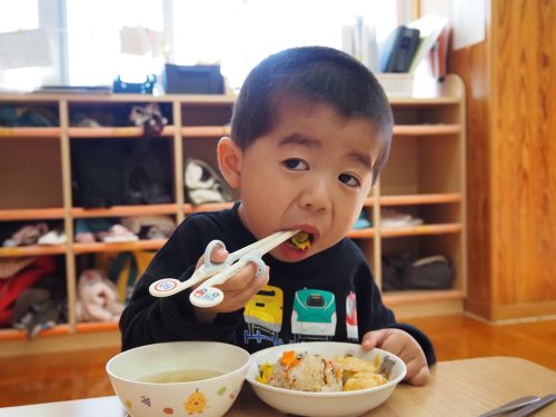 少しずつすくい持ちでスプーンを持つことが定着してきたり、箸で食べる子も増えてきたりと成長が多く見られてきました。進級に向けて残り3ヶ月も取り組んでいきたいと思います。