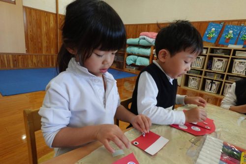 「今日は獅子舞を作るよ!」と言うと、「獅子舞ってなにー?」「見たことあるかな?」と考えこむ様子の子どもたち。