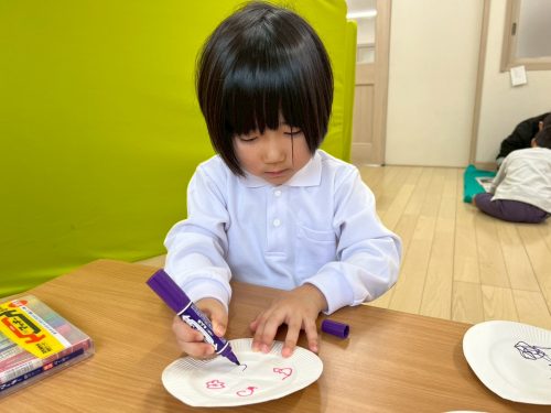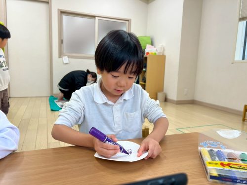 紙皿に絵を描き、ペットボトルのキャップをつけて軸にします。