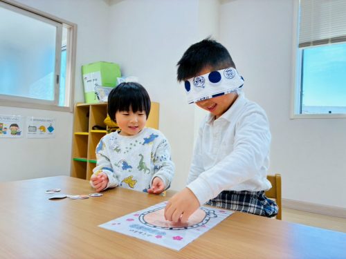 目隠しをしたお友だちに、「これは目だよ。」と教えてあげながらパーツを渡してあげる子どもたち。