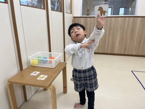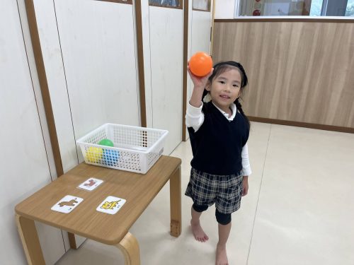 『馬の絵を左手で持つ』『オレンジ色のボールを持つ』と伝わった内容を行動に移すことができていました☆