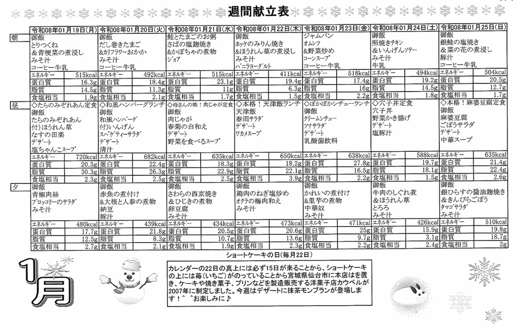 1月19日(月)~1月25日(日)の献立表になります。ぜひご覧ください。