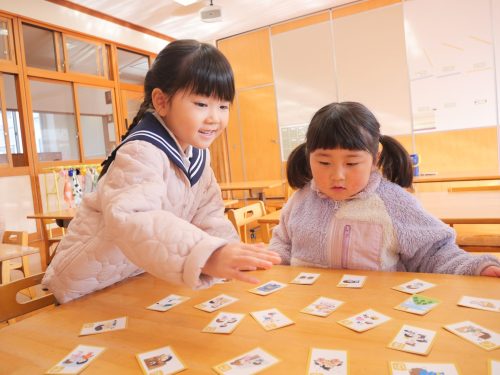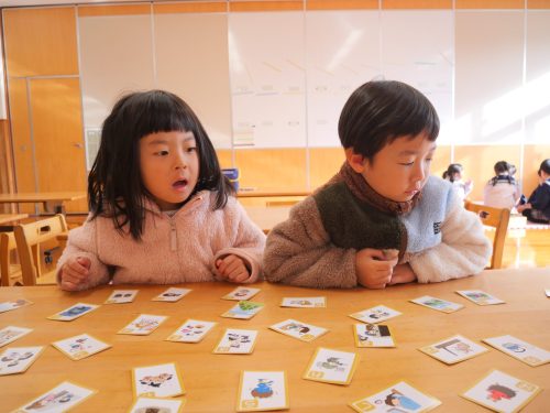 「あけましておめでとうございます!」と久々に会う友だち同士で言い合う姿が多く見られた数日間。 うさぎ組では、今、伝統遊びの「かるた遊び」に夢中です! 「やったことあるよ!」とお家でやったこともある子もいれば 「初めて見る!」と興味津々等、様々な反応の子どもたち。 回数を重ねるごとに、取るスピードも速くなり、熱戦した「かるた遊び」を 楽しむ子どもたち。 少しずつ読み手の方にも練習してみようと思います!