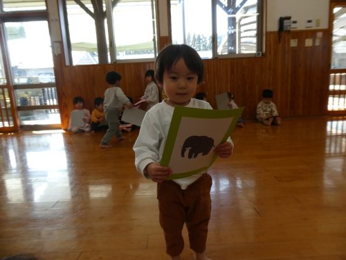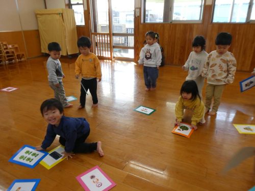 今月は4月からお集まりや歌の時間に練習してきた歌を使って歌かるたをして遊びました。音楽を聞いて、曲と同じイラストのカードを見つけるというルールを少しずつ理解しながら取り組むことができていました☆