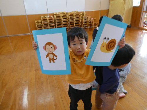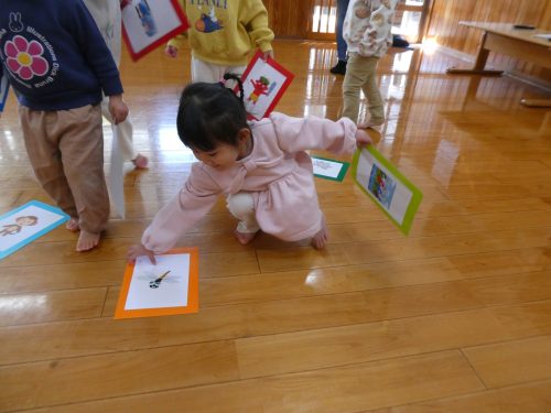 今月は4月からお集まりや歌の時間に練習してきた歌を使って歌かるたをして遊びました。音楽を聞いて、曲と同じイラストのカードを見つけるというルールを少しずつ理解しながら取り組むことができていました☆