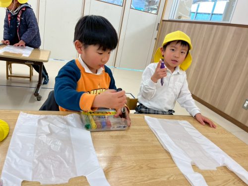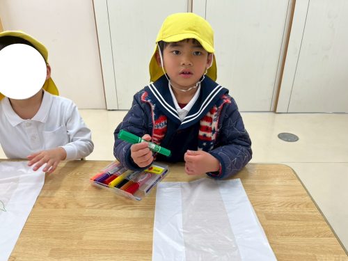 ビニール袋にそれぞれ好きな絵を描き、紐を結び付けてお外で飛ばしています。