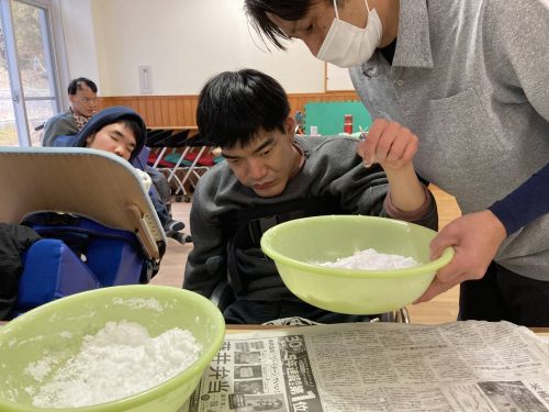 シェーピングフォームに重曹を少しづつ加えていくと、徐々に固まってきて・・・
