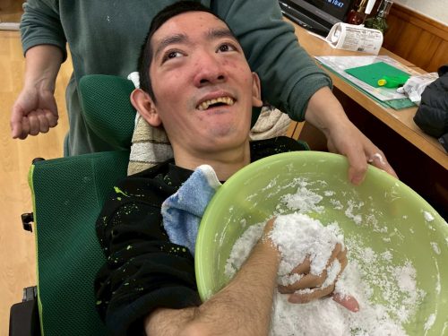 今日は作り立ての雪に、青色と黄色を混ぜてカラフルに仕上げてみました♪