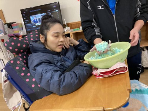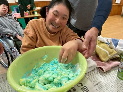 今日は作り立ての雪に、青色と黄色を混ぜてカラフルに仕上げてみました♪
