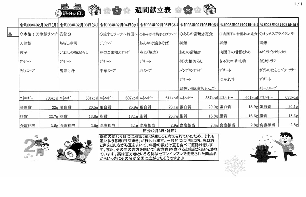 2月2日(月)~2月8日(日)の献立表になります。ぜひご覧ください。
