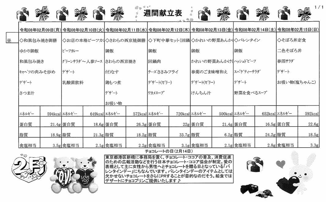 2月9日(月)~2月15日(日)の献立表になります。ぜひご覧ください。