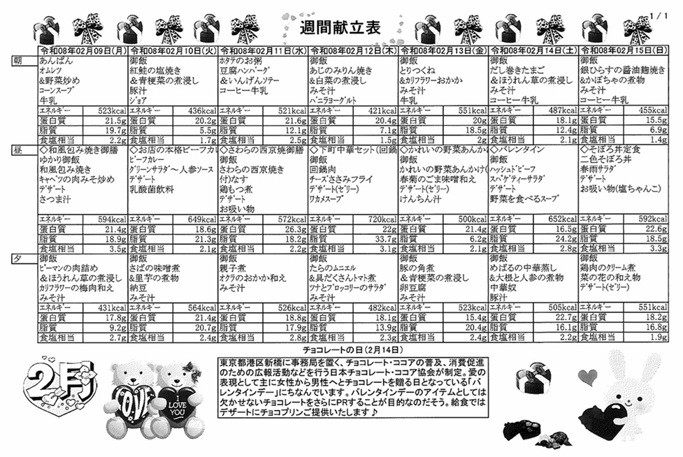 2月9日(月)~2月15日(日)の献立表になります。ぜひご覧ください。