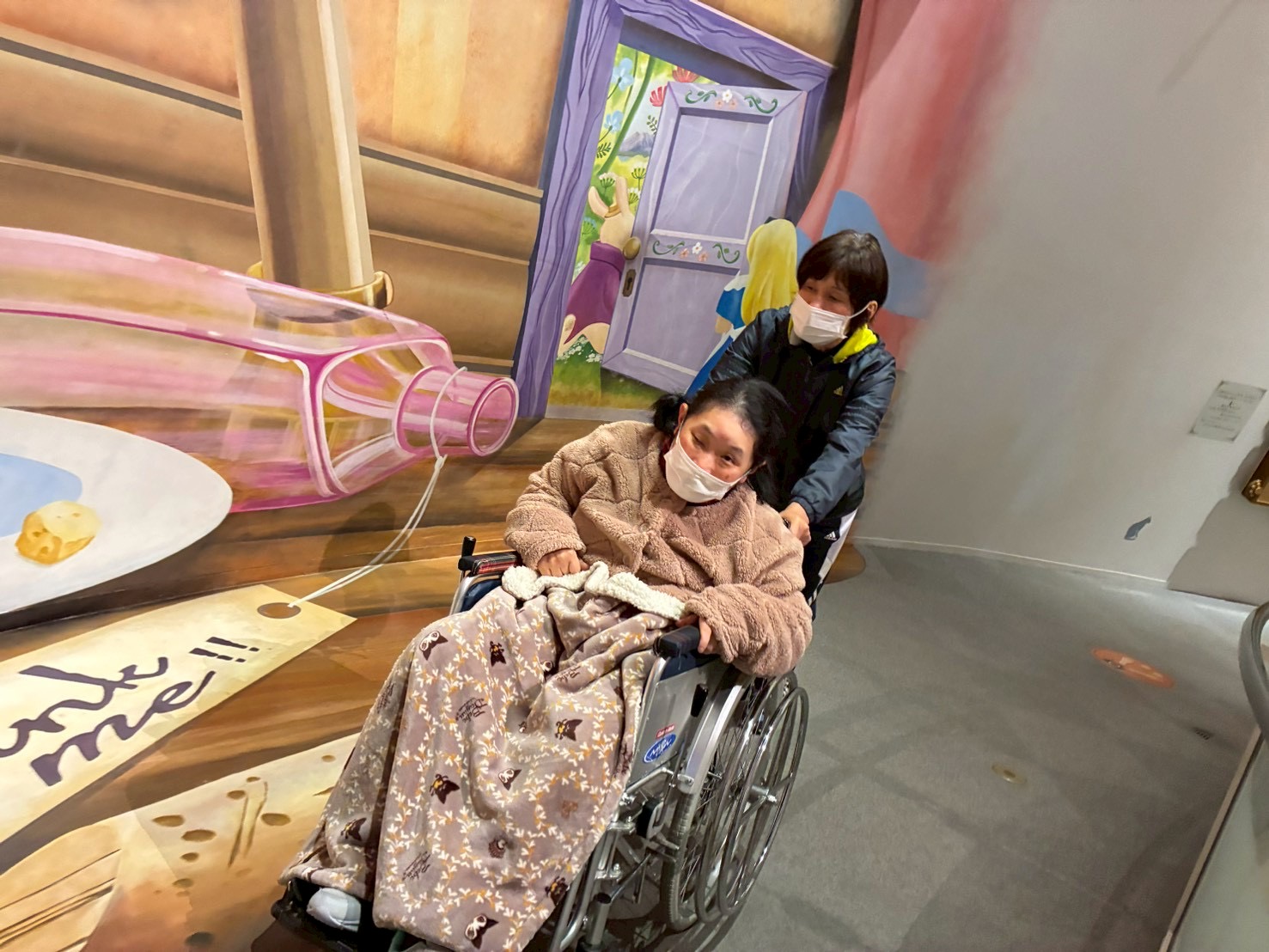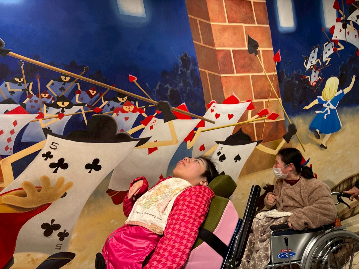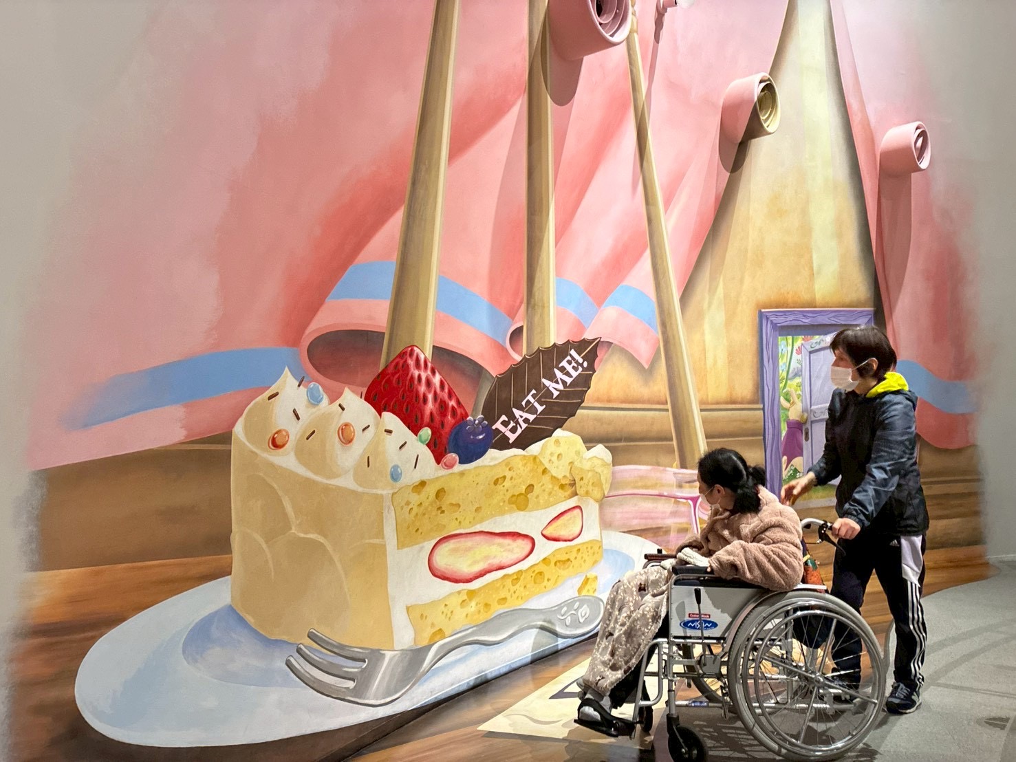 今日はメルヘン館で外出活動を行いました。 久しぶりのメルヘン館外出、楽しみにされている方も多かったみたいです♪ 不思議の国のアリスのトリックアートは圧巻でした! ピンクの可愛い箱からカスタードプリンや、パイナップルの良い香りがしました♪ なんだかお腹が空いてきますね。 角度によって子どもに見えたり、かわいい子ブタに見えたり不思議な絵もありました。 あっという間に帰りの時間が来てしまいました。 次回の外出活動に参加される方も楽しみにしておいてくださいね♪