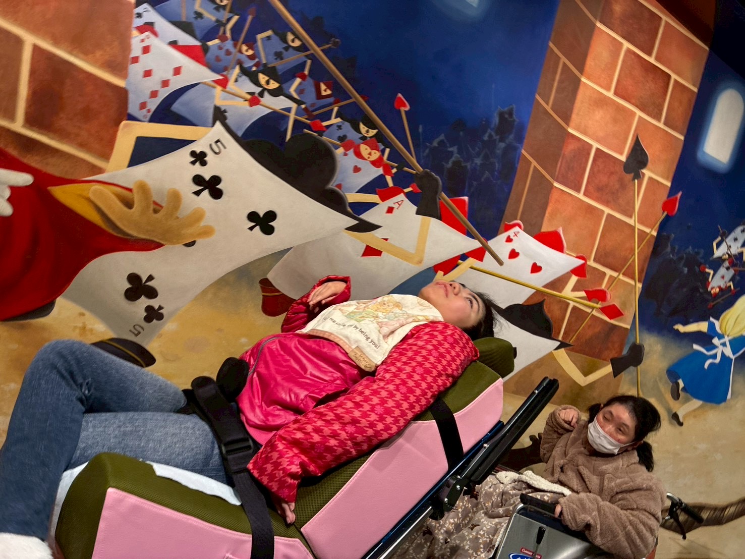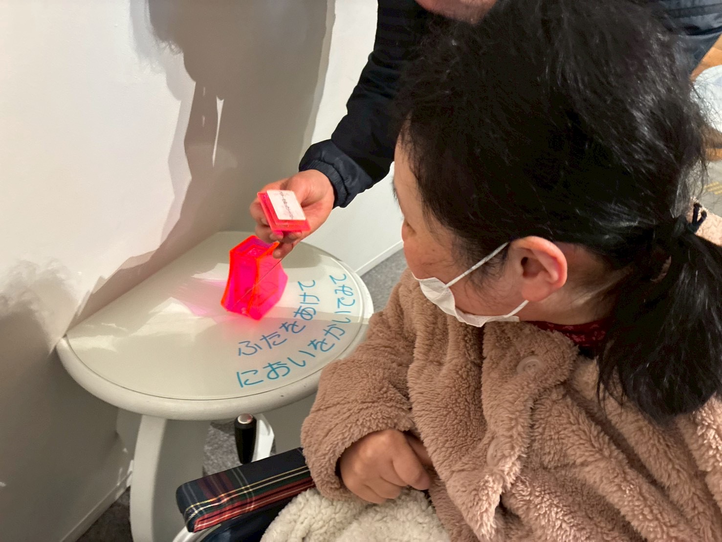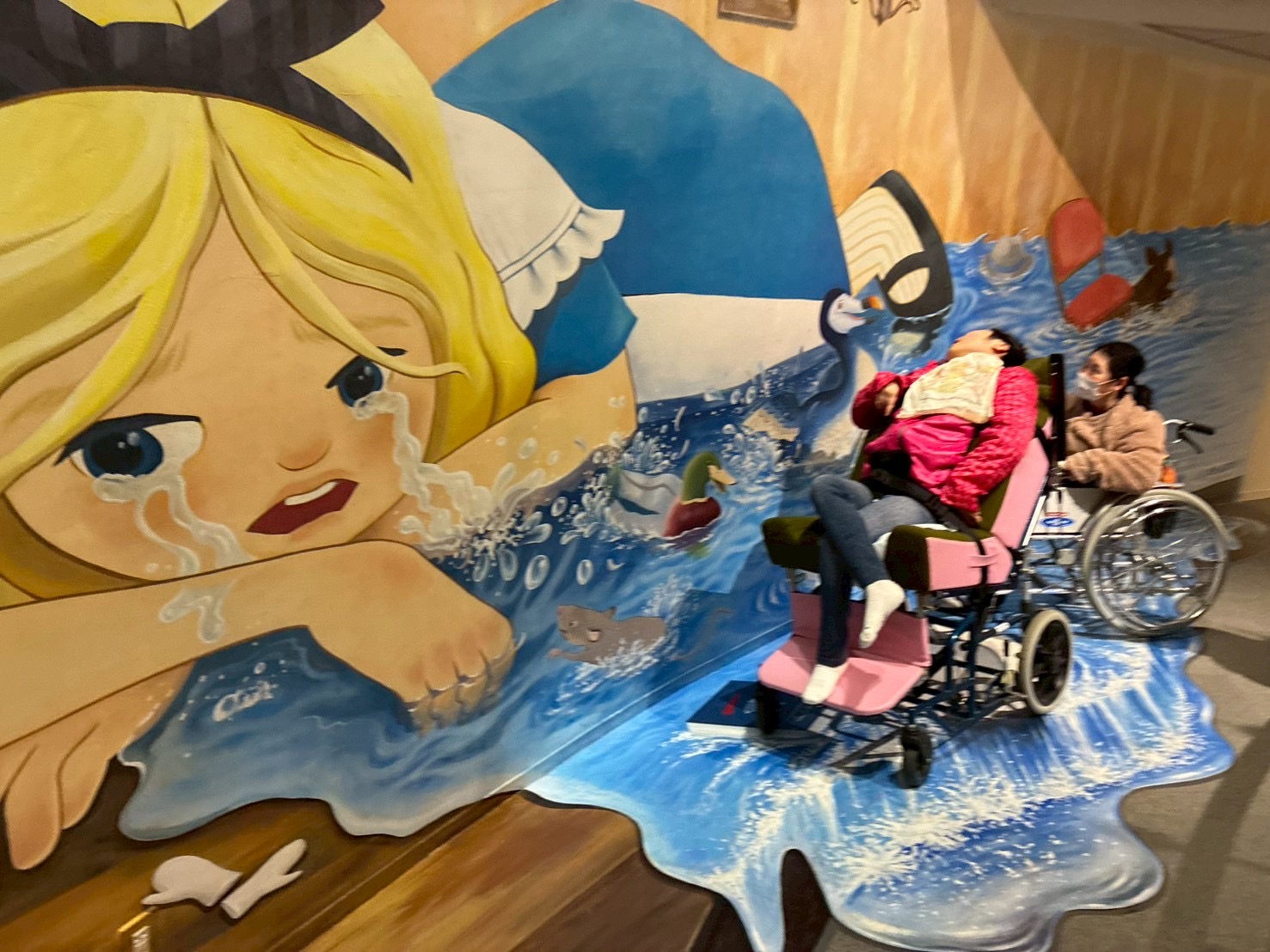 今日はメルヘン館で外出活動を行いました。 久しぶりのメルヘン館外出、楽しみにされている方も多かったみたいです♪ 不思議の国のアリスのトリックアートは圧巻でした! ピンクの可愛い箱からカスタードプリンや、パイナップルの良い香りがしました♪ なんだかお腹が空いてきますね。 角度によって子どもに見えたり、かわいい子ブタに見えたり不思議な絵もありました。 あっという間に帰りの時間が来てしまいました。 次回の外出活動に参加される方も楽しみにしておいてくださいね♪