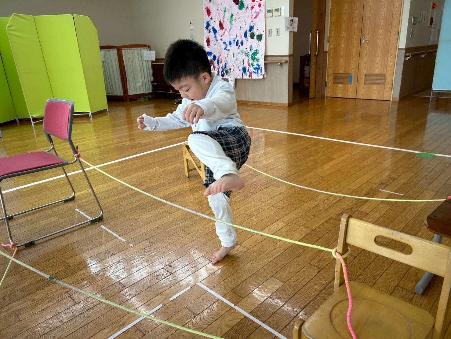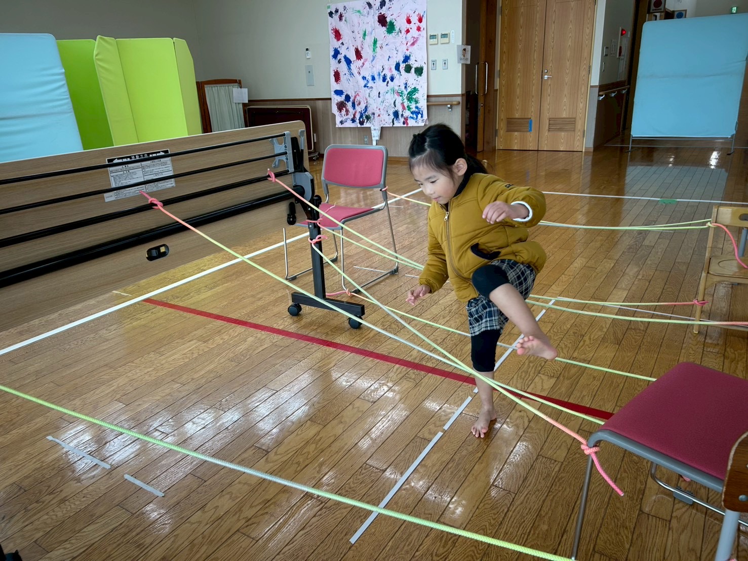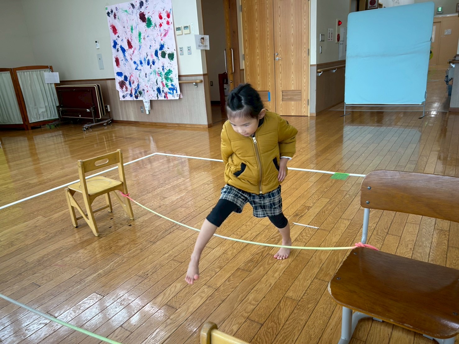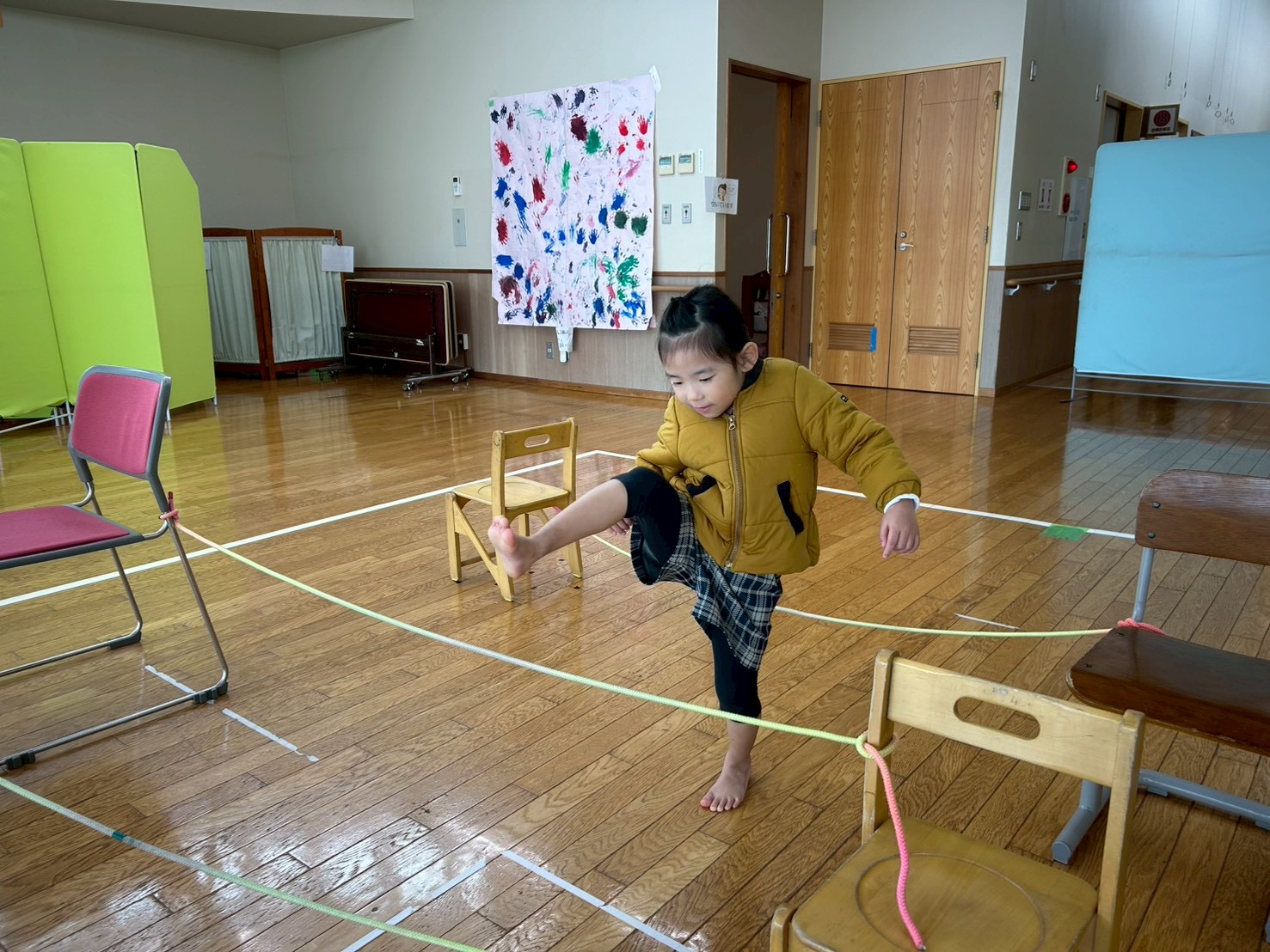 跨ぐ練習をした後は、椅子や机等を配置し、5つの縄を跨ぐ練習に挑戦しています。