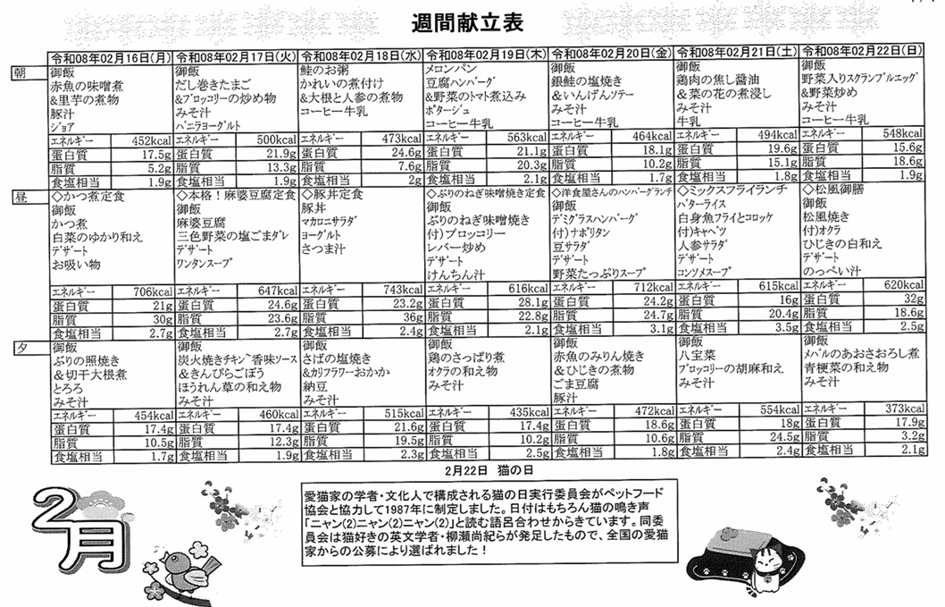 2月16日(月)~2月22日(日)の献立表になります。ぜひご覧ください。