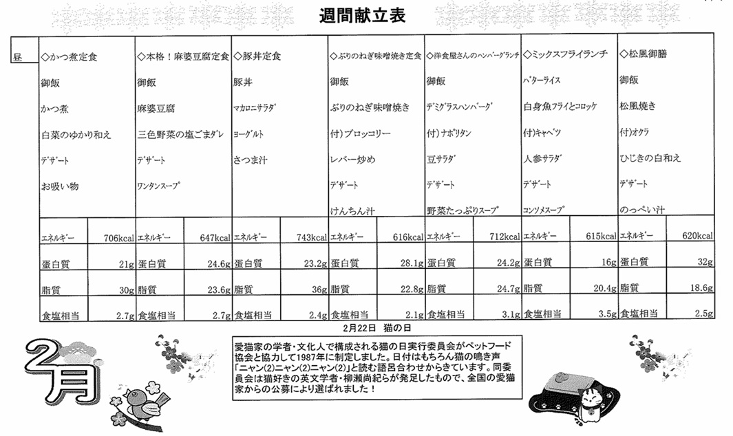 2月16日(月)~2月22日(日)の献立表になります。ぜひご覧ください。