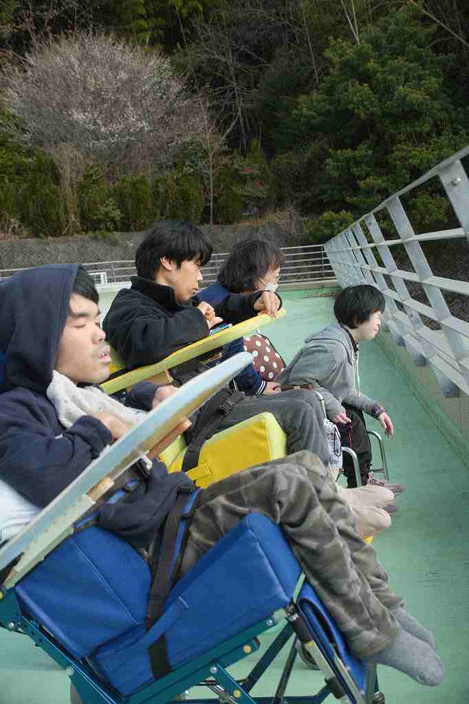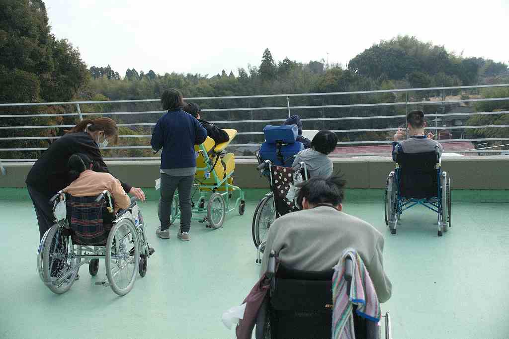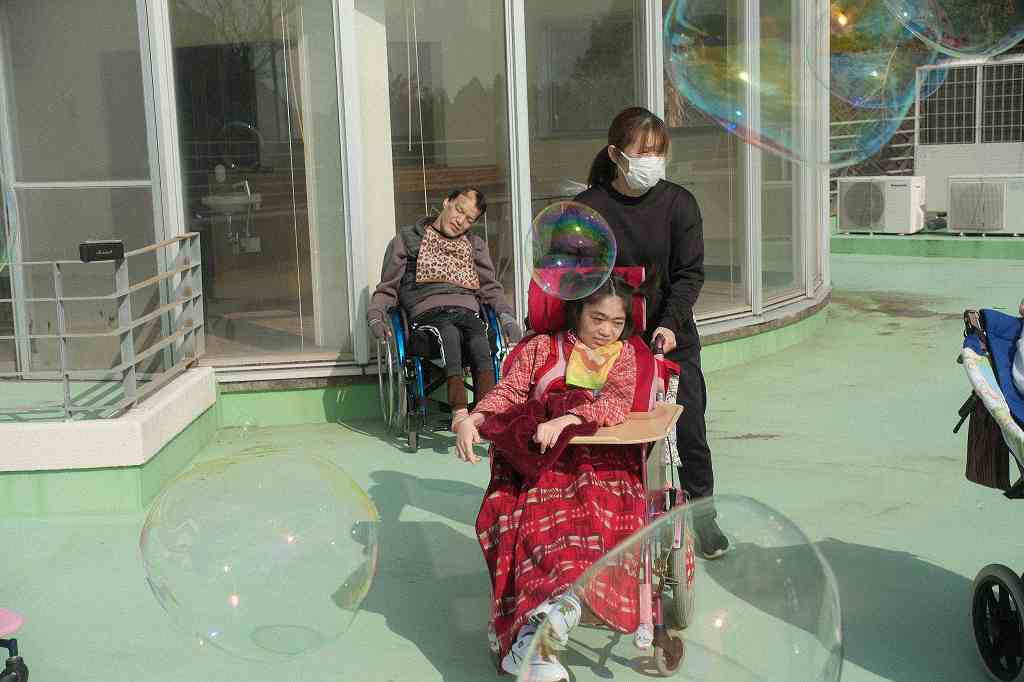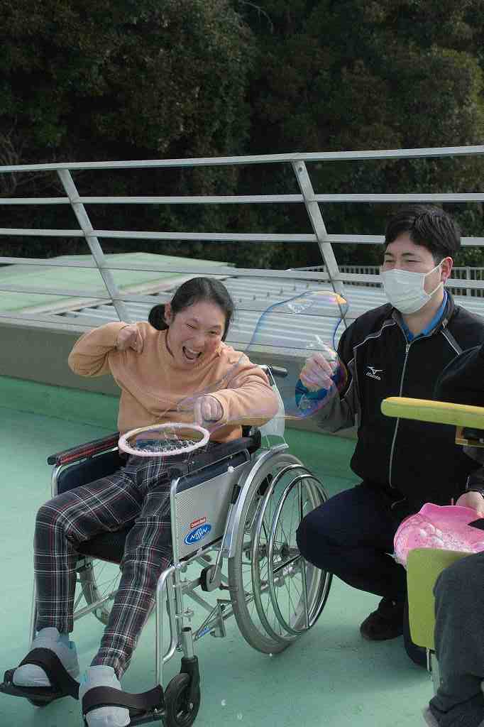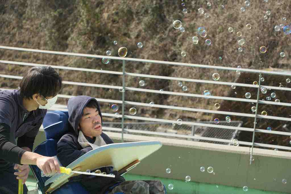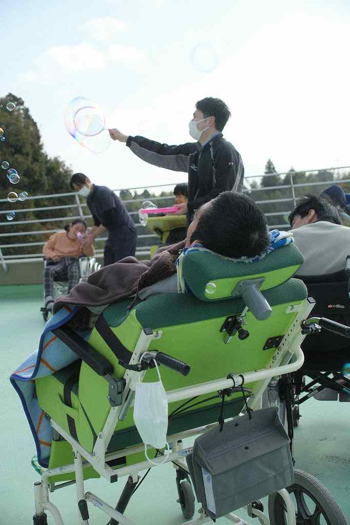 今日はひなた屋上で散策とシャボン玉レクを行いました。