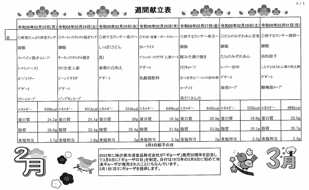 2月23日(月)~3月1日(日)の献立表になります。ぜひご覧ください。