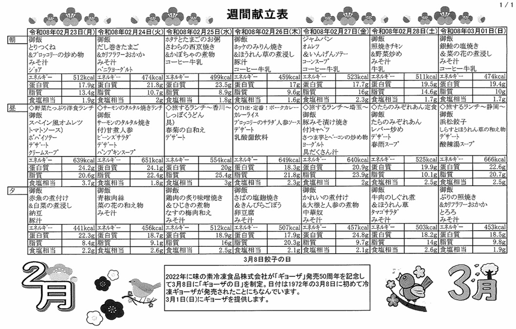 2月23日(月)~3月1日(日)の献立表になります。ぜひご覧ください。
