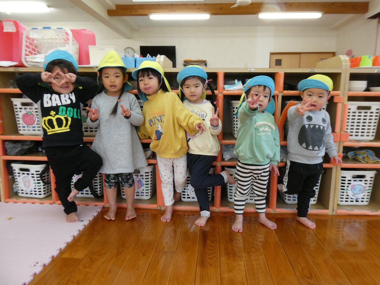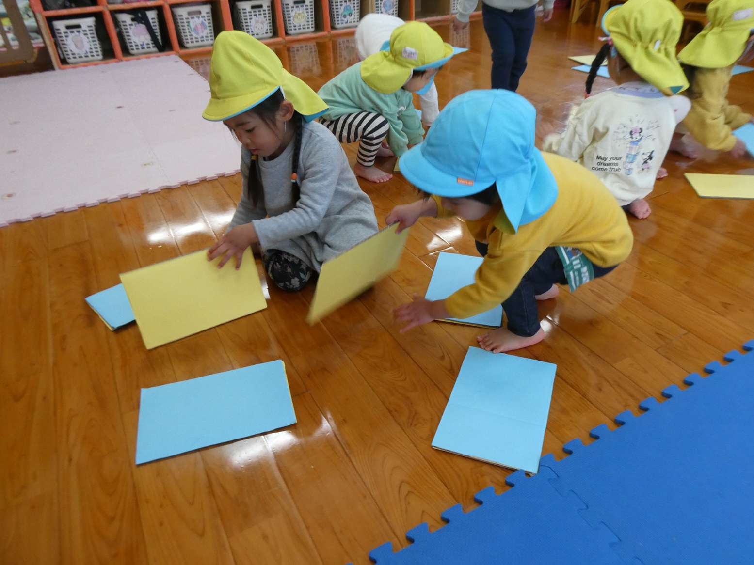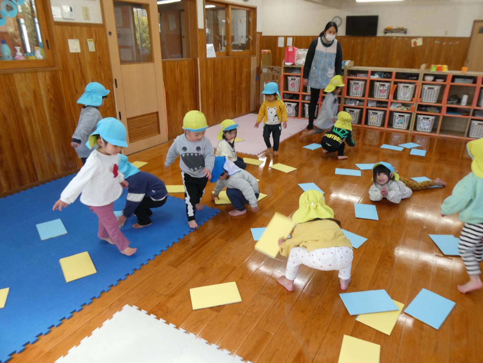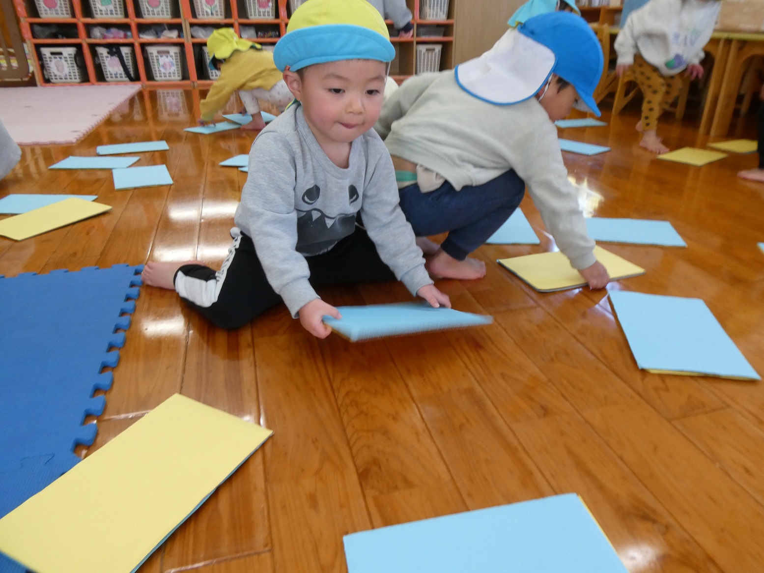 最近チームに分かれて競争するゲーム遊びを楽しんでいるぱんだ組さん。そのため、今日のおむすびの日はひっくり返しゲームをしました!