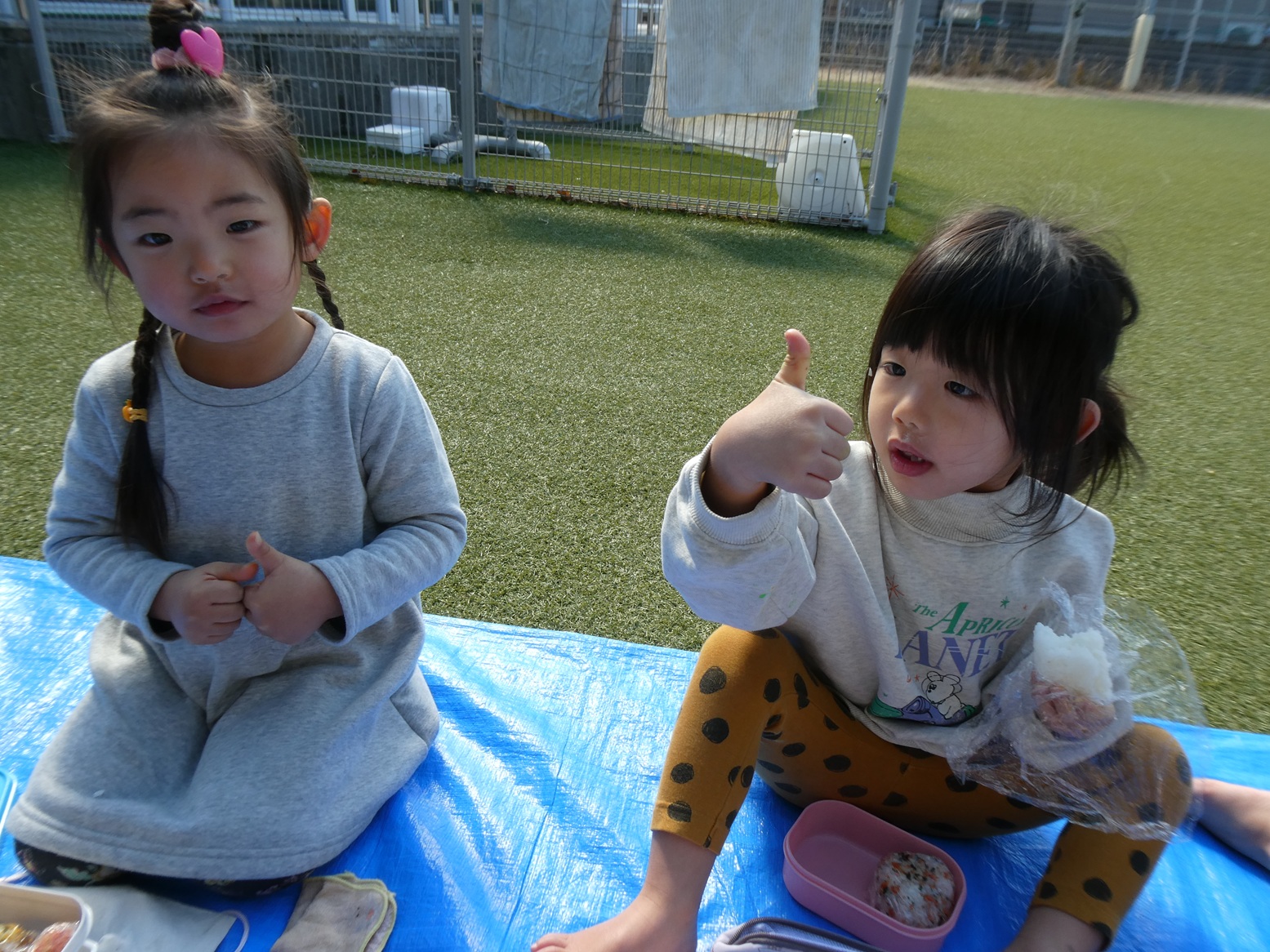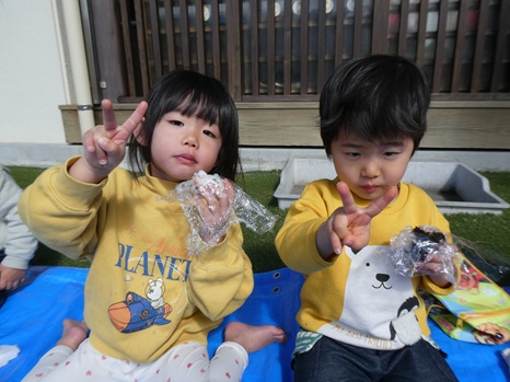 たくさん体を動かした後はおむすびの時間。今日は初めて園庭で食べました!