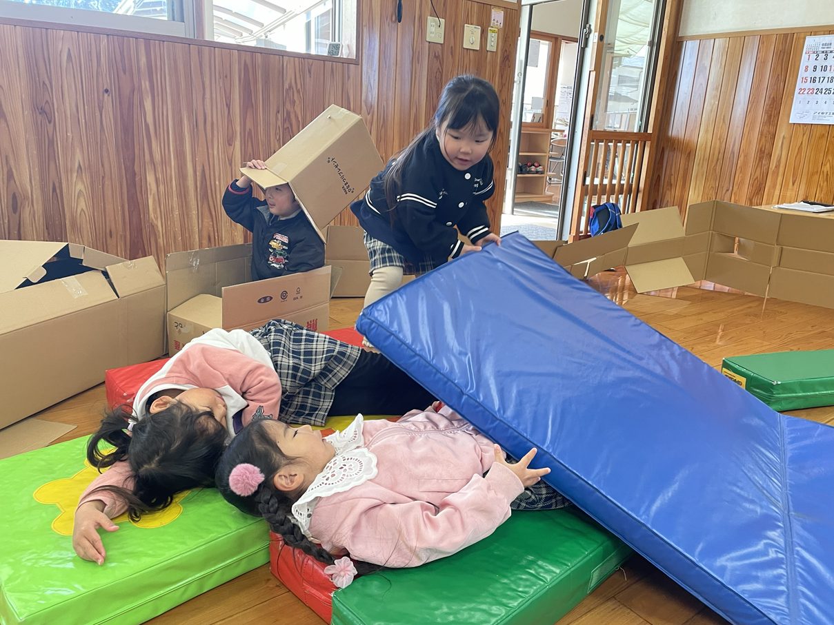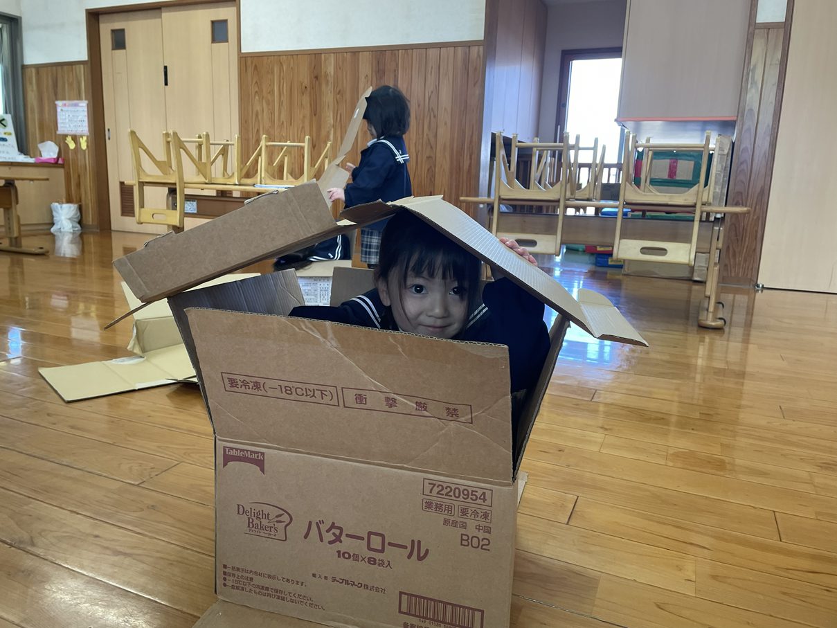 「お家を作ろう!」と多くの子が段ボールを組み立てて小さな家を作って中に入ってみたり、布団に見立てて昼寝を始めたり様々な見立て遊びがスタートです。