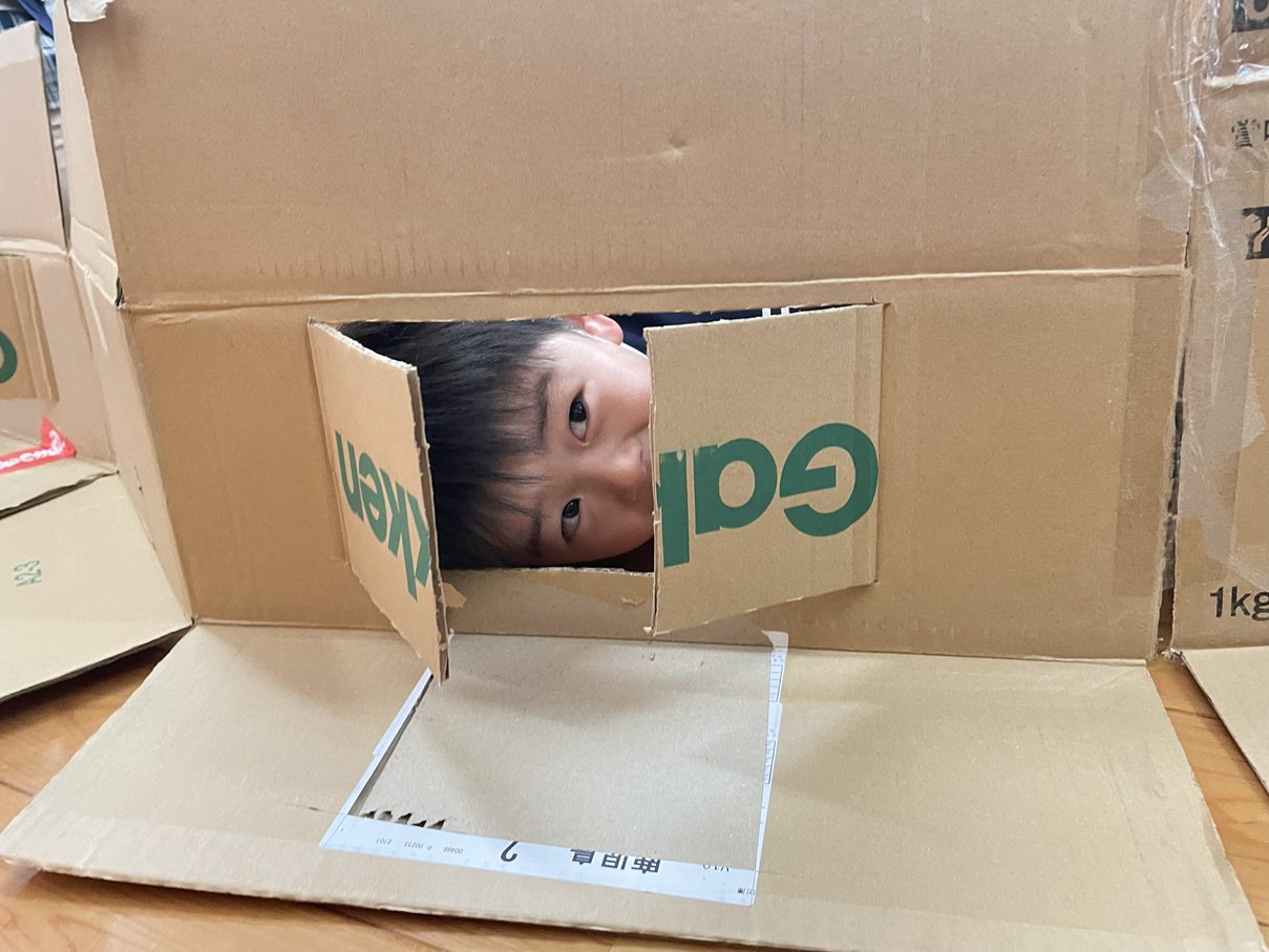 また、段ボールの壁にいくつか切り込みを入れて窓を作ると、嬉しそうに開け広げて友だち同士のやりとりやお店屋さんごっこが始まったりと様々な遊びに発展させて楽しむ子どもたちでした。