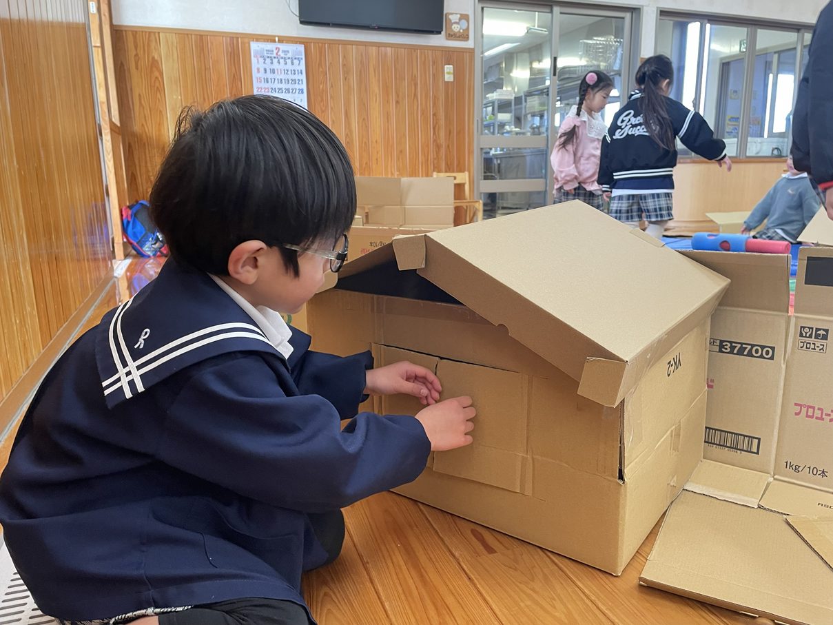 中には「段ボールが小さくてお家が作れない・・・あ!合体させたらいいんじゃない!」と新たな閃きからいくつかの段ボールを切って繋げて大きな家づくりに発展していきます。