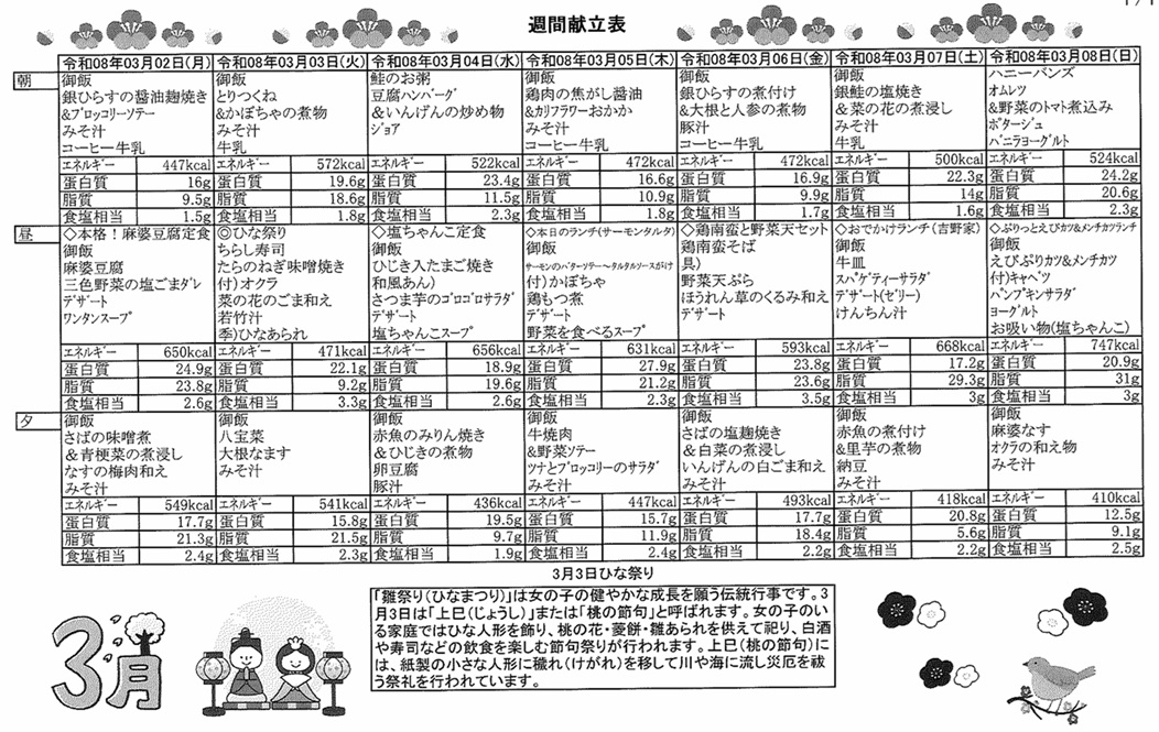 3月2日(月)~3月8日(日)の献立表になります。ぜひご覧ください。