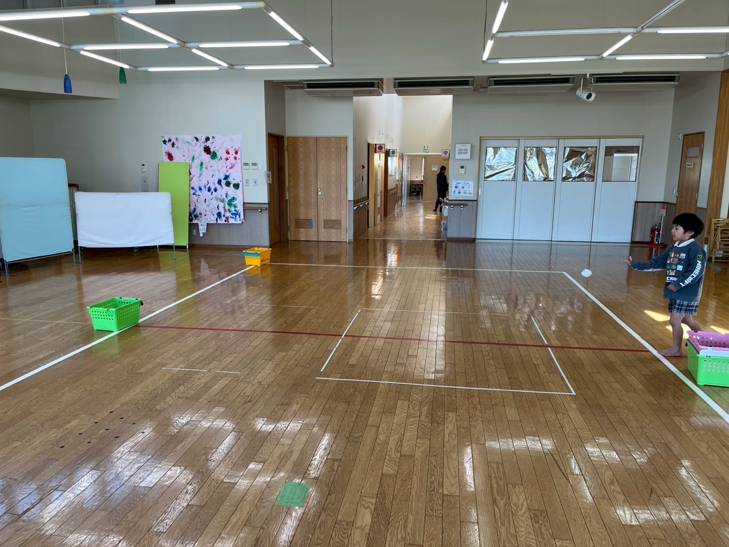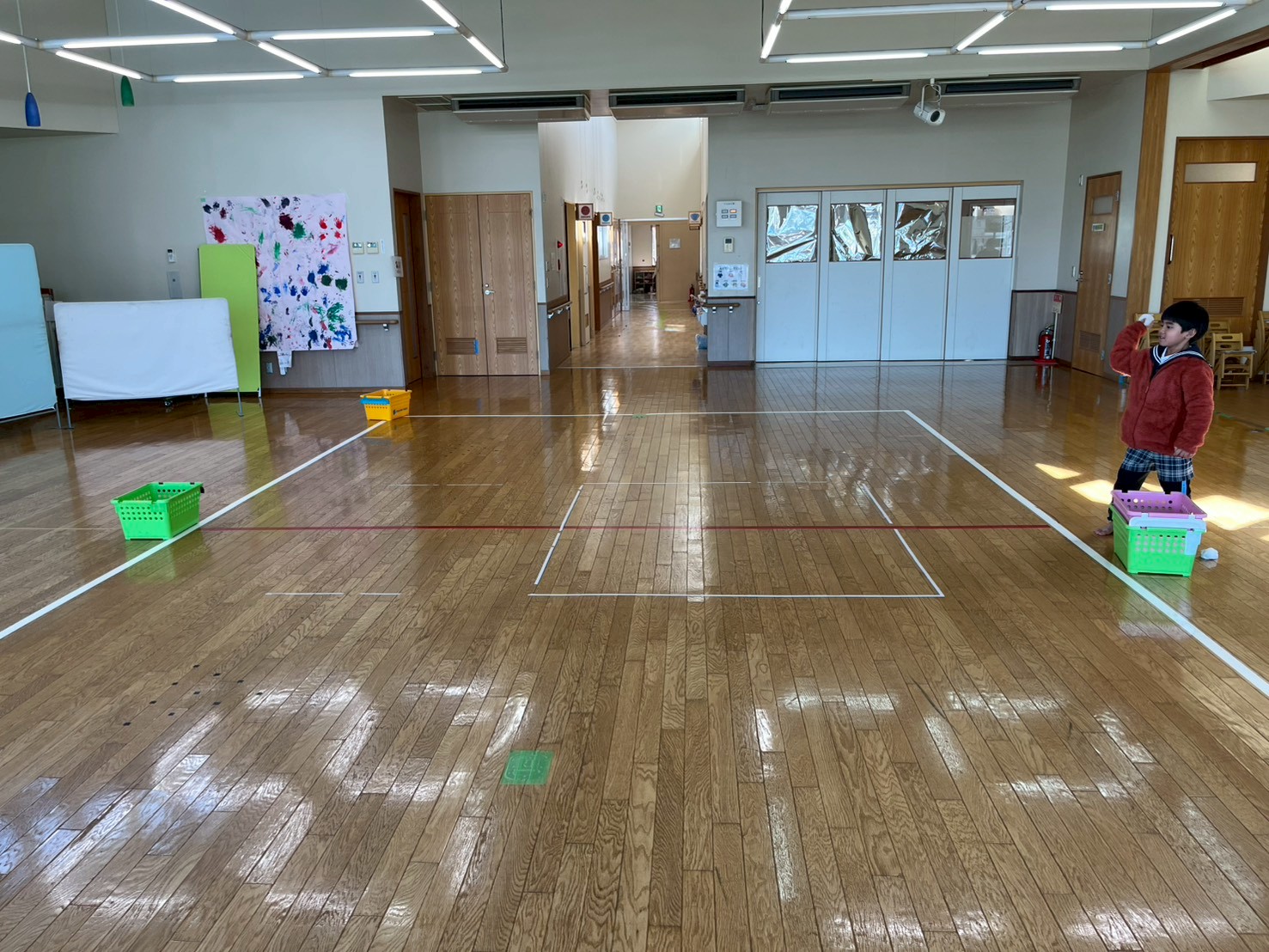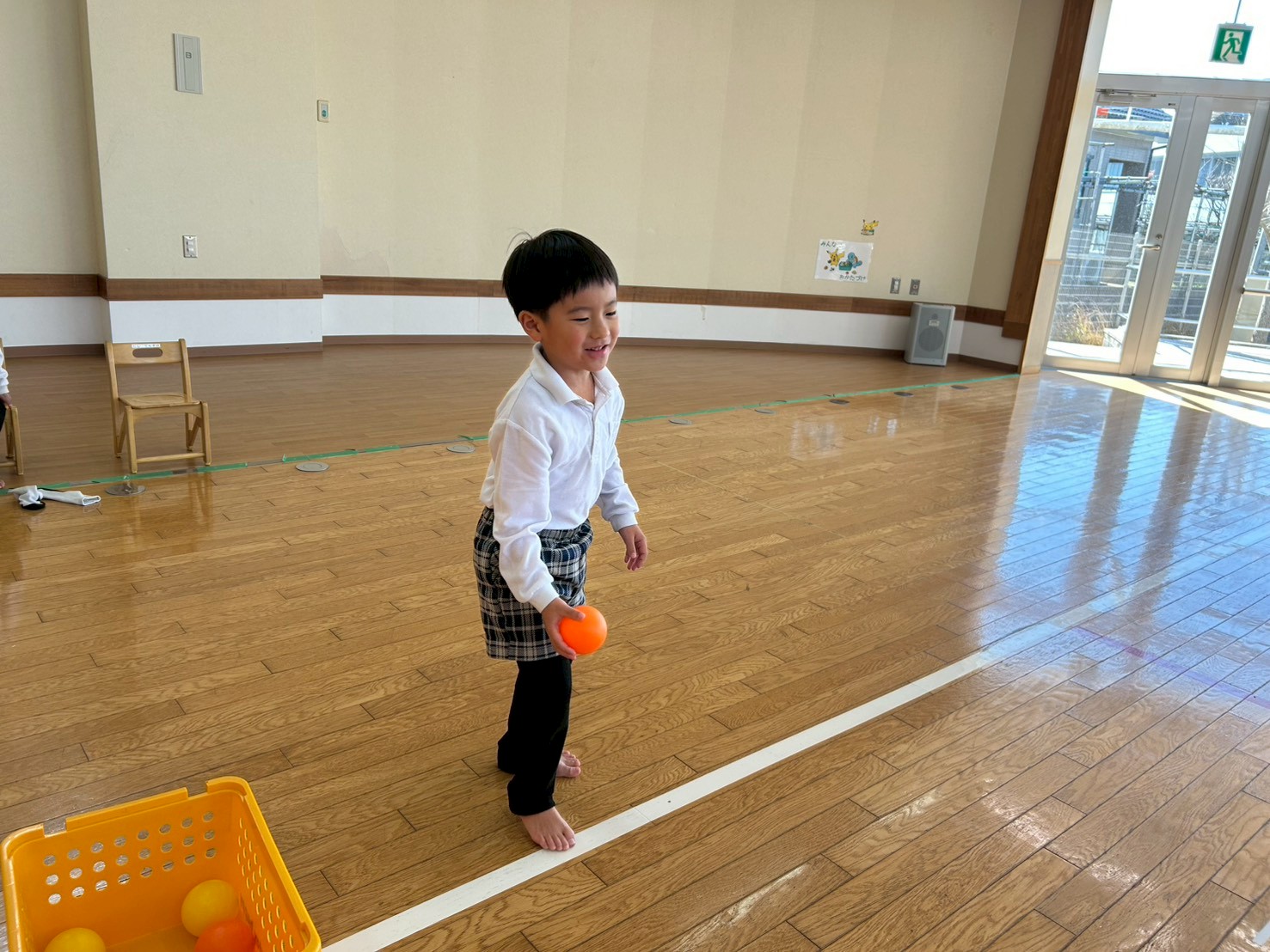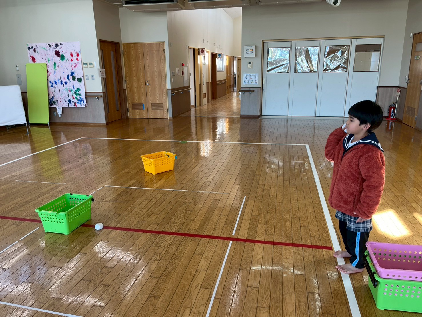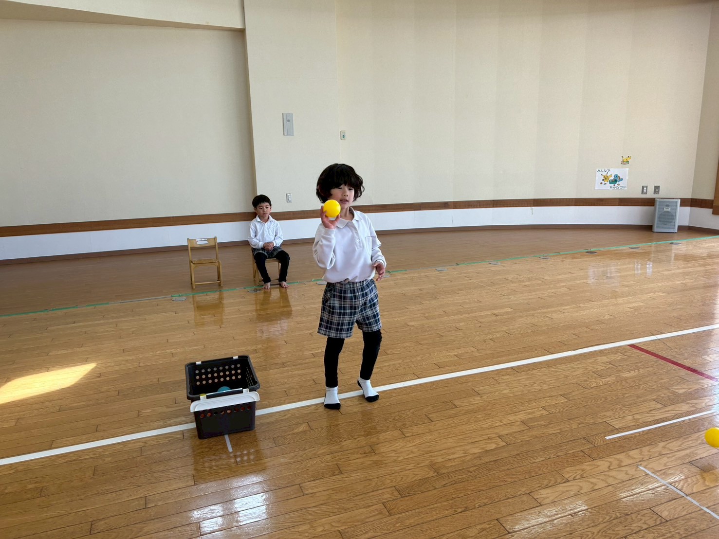今回、ぞうグループさんは玉入れを行いました。 カゴを狙ってお手玉やカラーボールを投げ、カゴの位置をどんどん遠くにしながら取り組んでいます。 始めは、カゴの位置を近くして取り組むと… カゴとの距離に合わせて力加減を調整することができ、たくさんかごに入れることができています。 最後は、難易度をあげ、カゴの距離を遠くにして挑戦しました! 「下投げの方がいいかも。」「カゴに当たったよ!」と何度も繰り返すうちに、自分に合った投げ方を見つけて、コツを掴むことができたぞうグループさんでした♪
