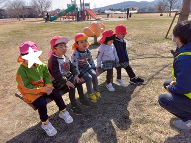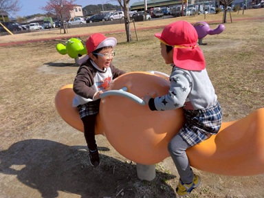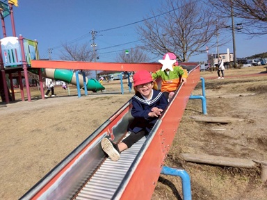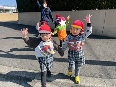 朝からお天気も良く、お茶の里公園にお出かけをしました! 公園までの道のりには、大きな横断歩道を渡ります。 しっかりと運転手さんに見えるように、手を挙げて渡る子どもたち。 公園に着くと、まずマラソンコースをみんなで走りました。 手をいっぱい振って、ゴールまで諦めずに走り切ることができました。 たくさん走った後は、大きなシーソーや長い滑り台を使って身体を動かし、 「わー!」と笑顔いっぱい滑る姿が見られ、次はどの公園に行こうかお話しをしながら帰るくまグループさんでした♪