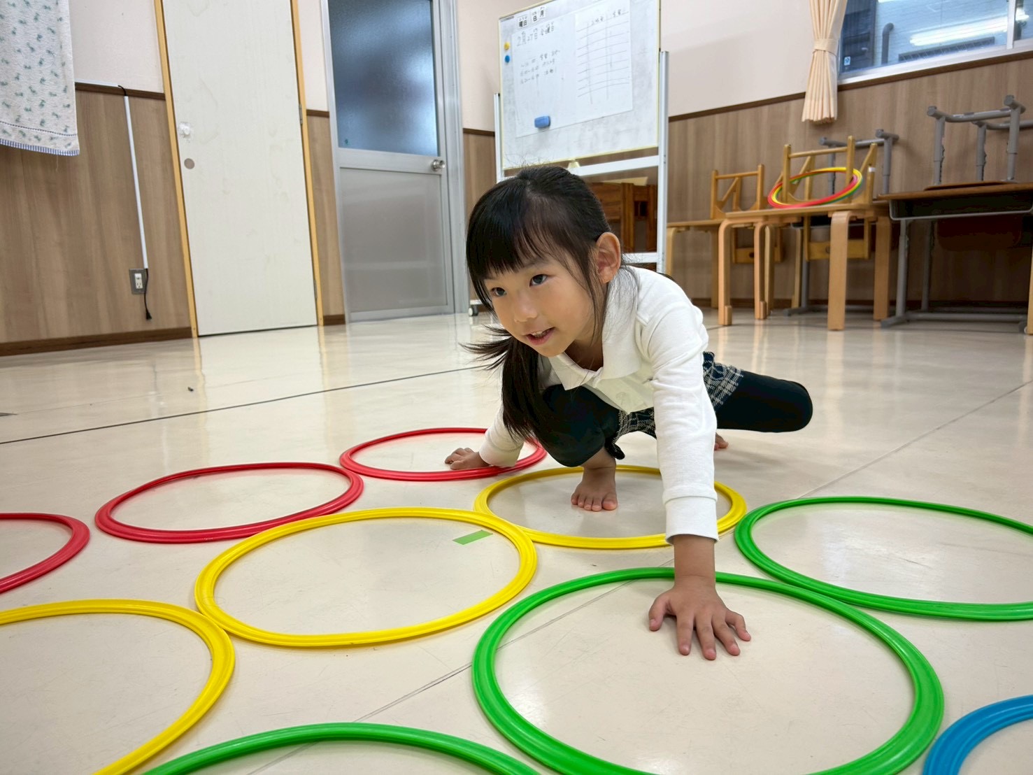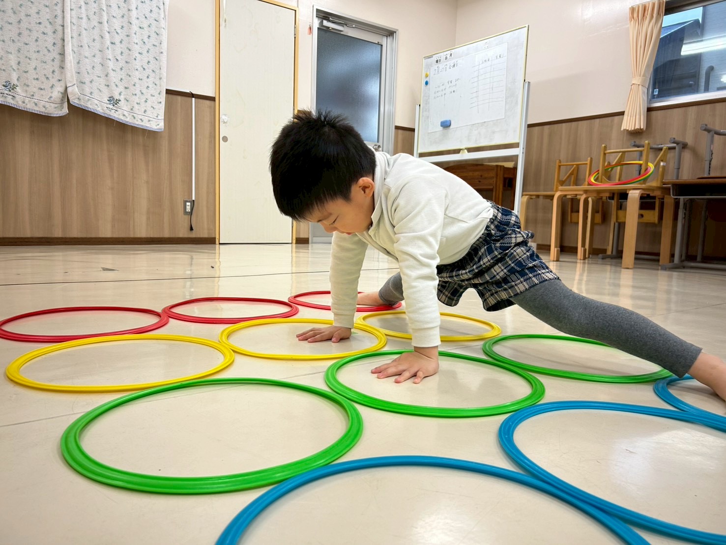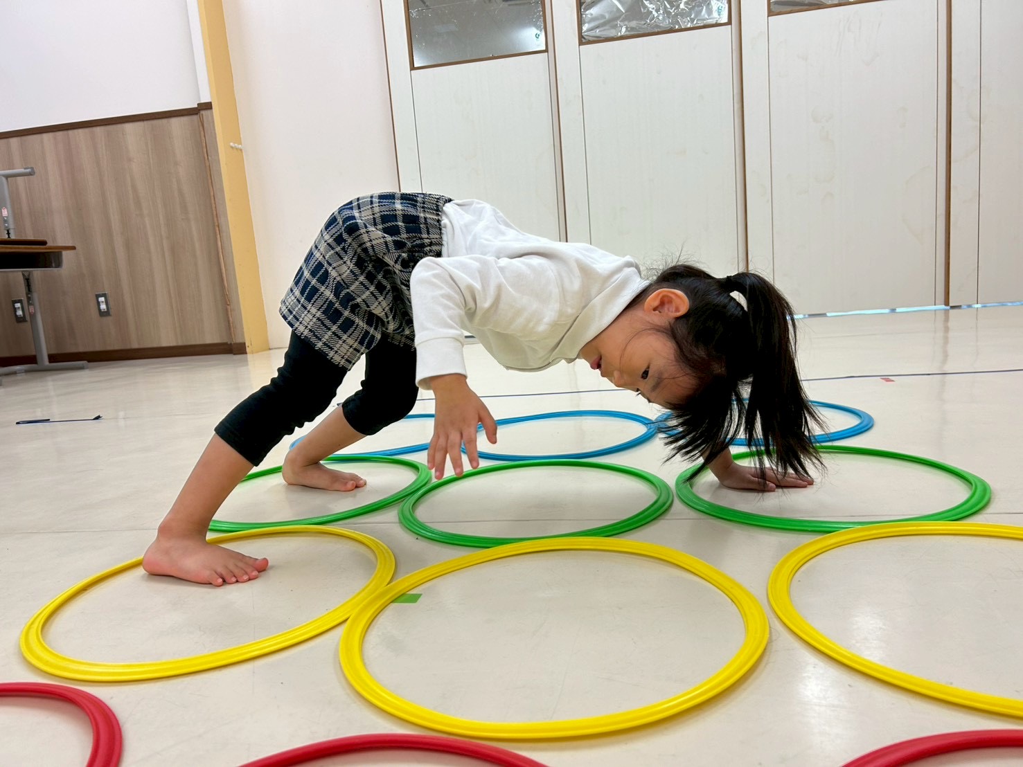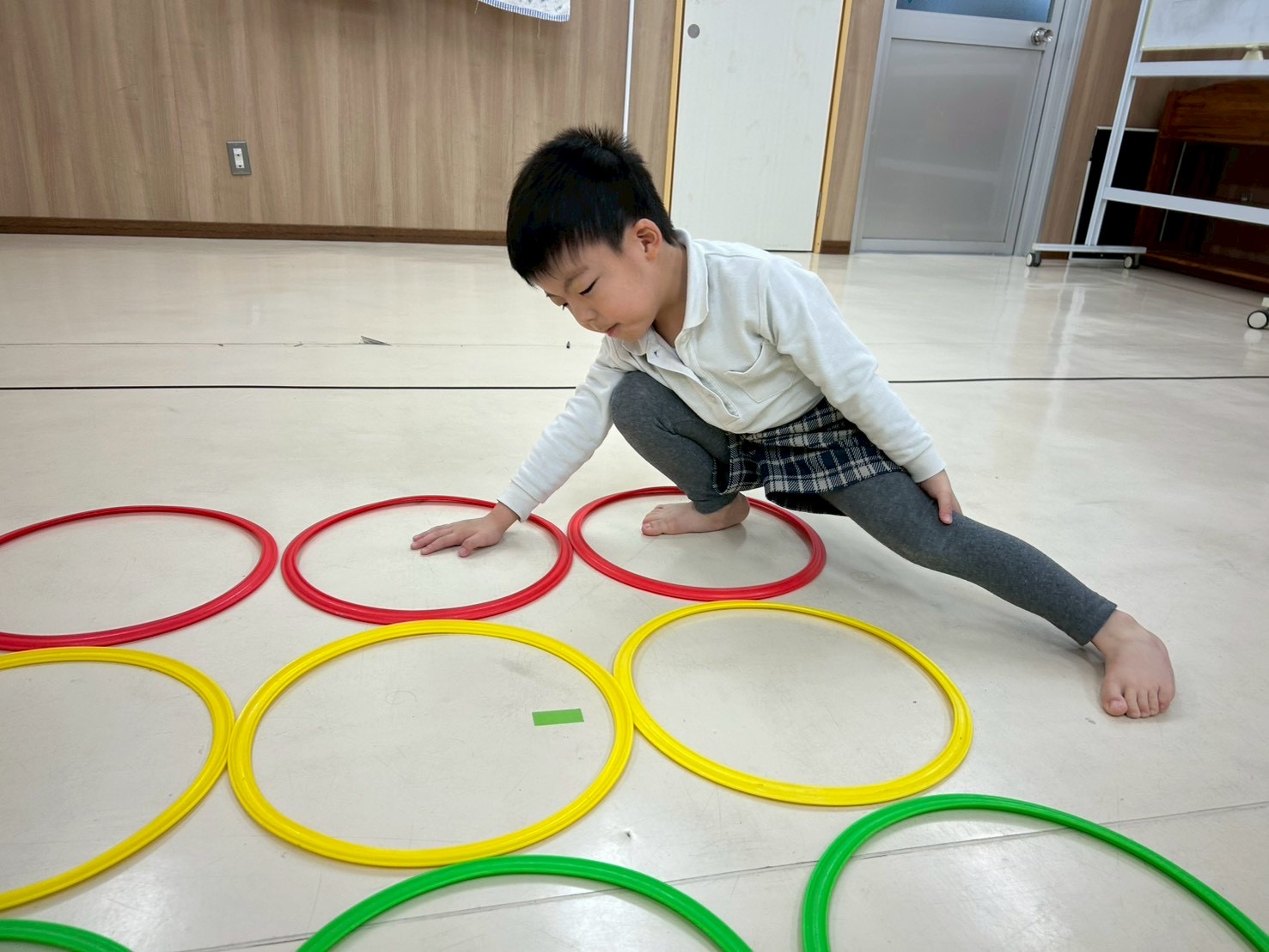 今回、とらグループでは、ツイスターゲームを行いました。 4色のケンケンパリングを縦横に3つずつ配置し、職員が指定した色のケンケンパリングに手足を動かし、バランスを取ることに挑戦しています。 初めは、「簡単だよ!」「見て、先生行けた!」とバランスを取りながら、職員から指定されたことをどんどんこなすことができていました☆ 後半になると、バランスを崩さないように手足を大きく広げる様子から柔軟性を養うことができています☆ 「もうだめかも!」「でも、楽しかった!」と笑顔いっぱいなとらグループさんでした♪