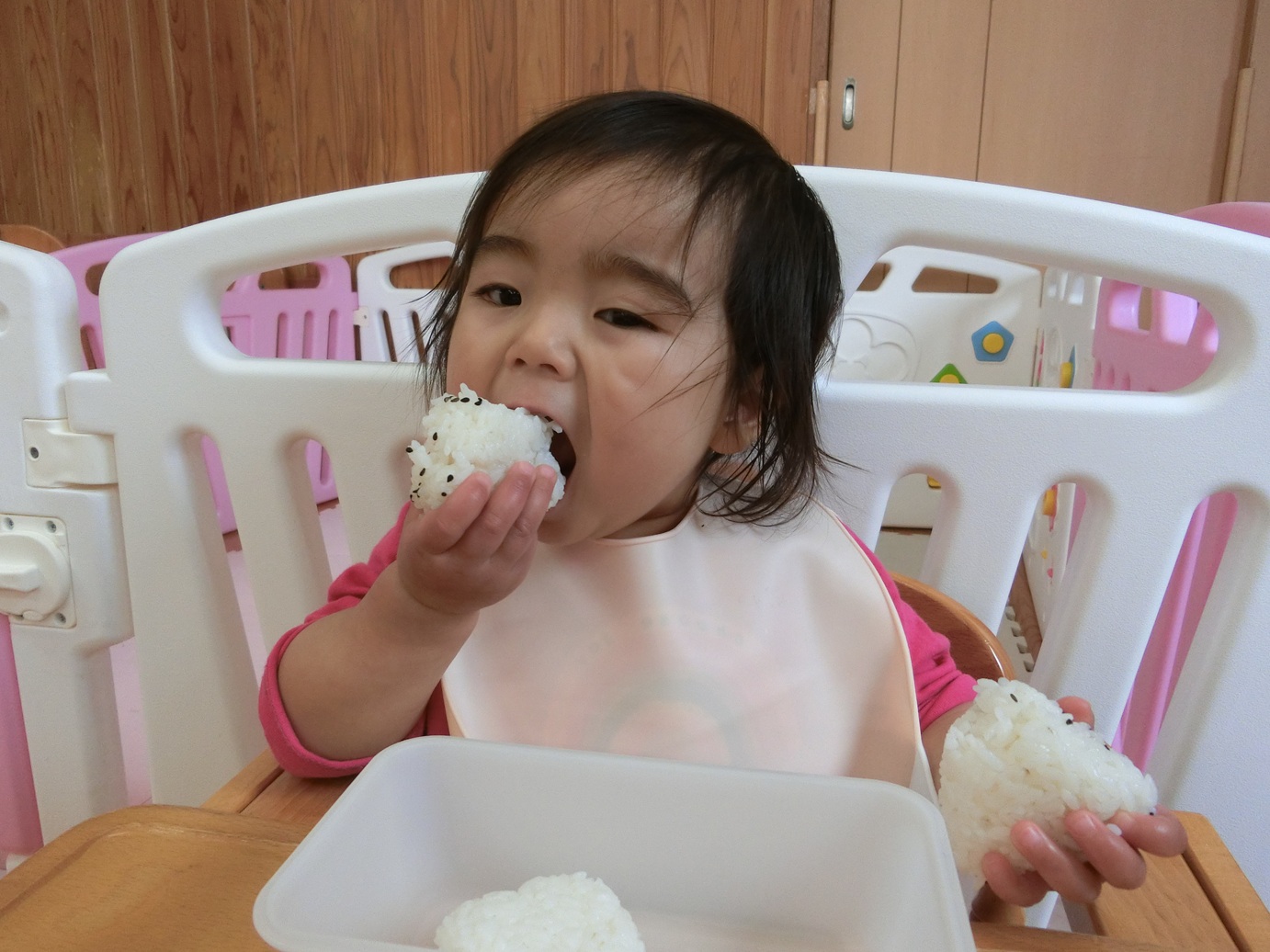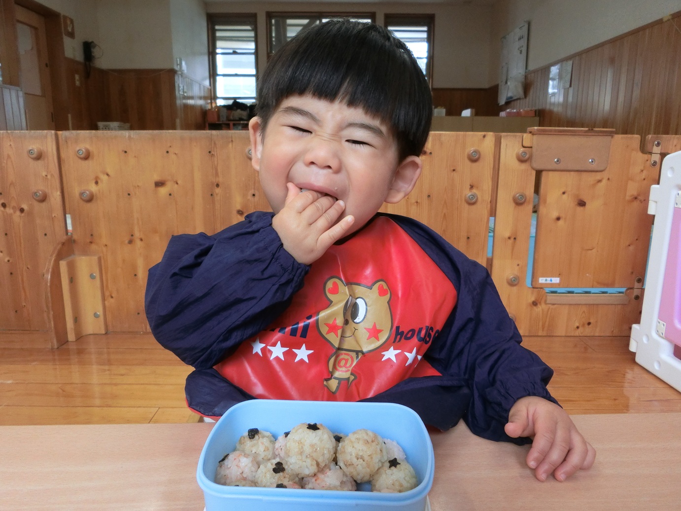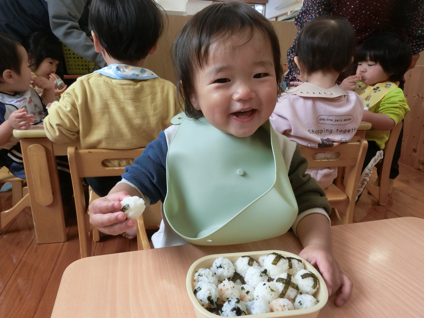 ひよこ組さんで食べる最後のおむすびの日でした。 全員の登園は難しかったですが、登園した友だちとのおむすびを楽しみにする子どもたち。 最初の頃は援助が必要だった子どもたちも、自分でおむすびを持って食べることができるようになりました! ひと口食べると手を頬に当てたり、「おいしっ♪」と言ったりひよこ組さんのお友だちと食べる最後のおむすびを楽しみました♪ おむすびのご準備ありがとうございました。