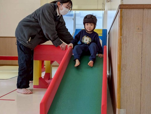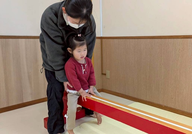 平均台や滑り台、平均台ブロックなどを使ってコースを作ると、職員と手を繋ぎながら慎重に渡る様子が見られました。