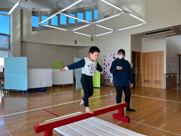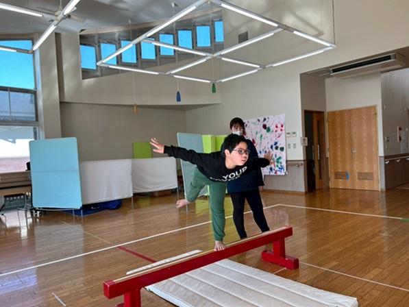背筋をピンと伸ばした姿勢や、飛行機のように体勢をかがめた姿勢など、子どもたちそれぞれでバランスを取って平均台に乗ることができています!