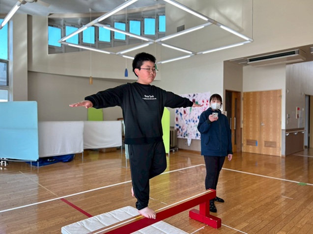 まずは、平均台の上に片足立ちで10秒間立つことに挑戦!