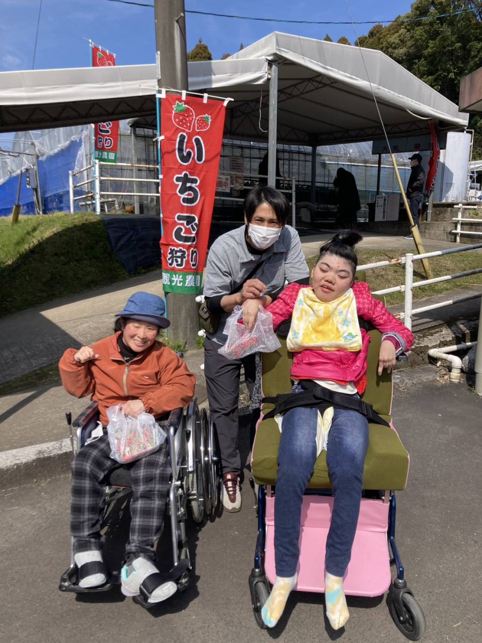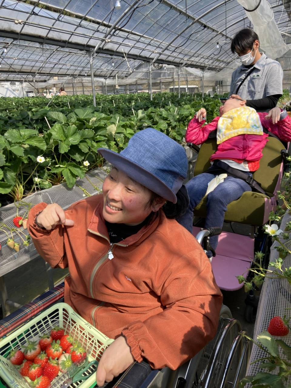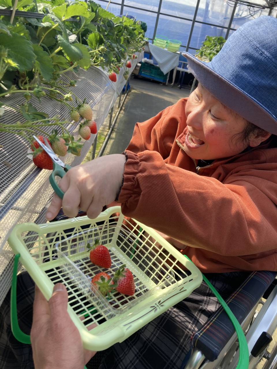 今日は3班目がいちご狩りへチェスト館に向かいました! 今日のいちご狩りをとても楽しみにされていたようです♪ 大振りで、とっても美味しそうないちごを取ることができました♪ 採れたてのいちごをはどんな感触でしょうか? 今回のいちご狩りも、美味しそうなイチゴをたくさん収穫することが出来ました! ご家族の方と一緒に美味しいイチゴを食べてくださいね♪ また次回、いちご狩りに参加される方も楽しみにしておいてくださいね!
