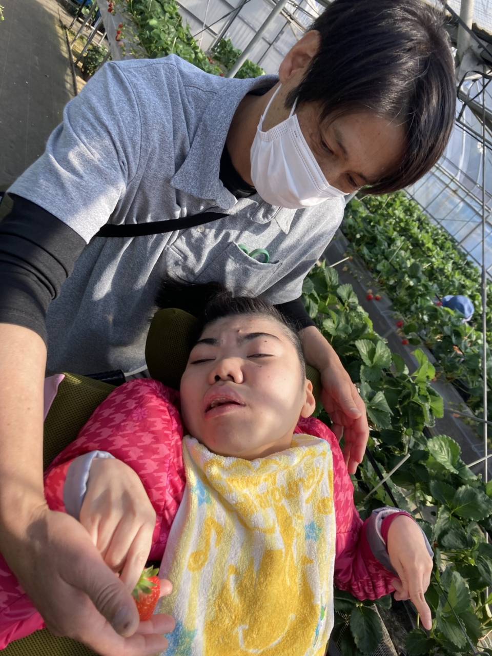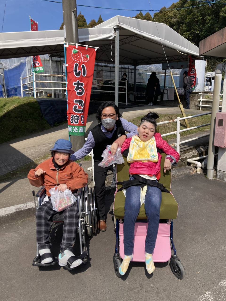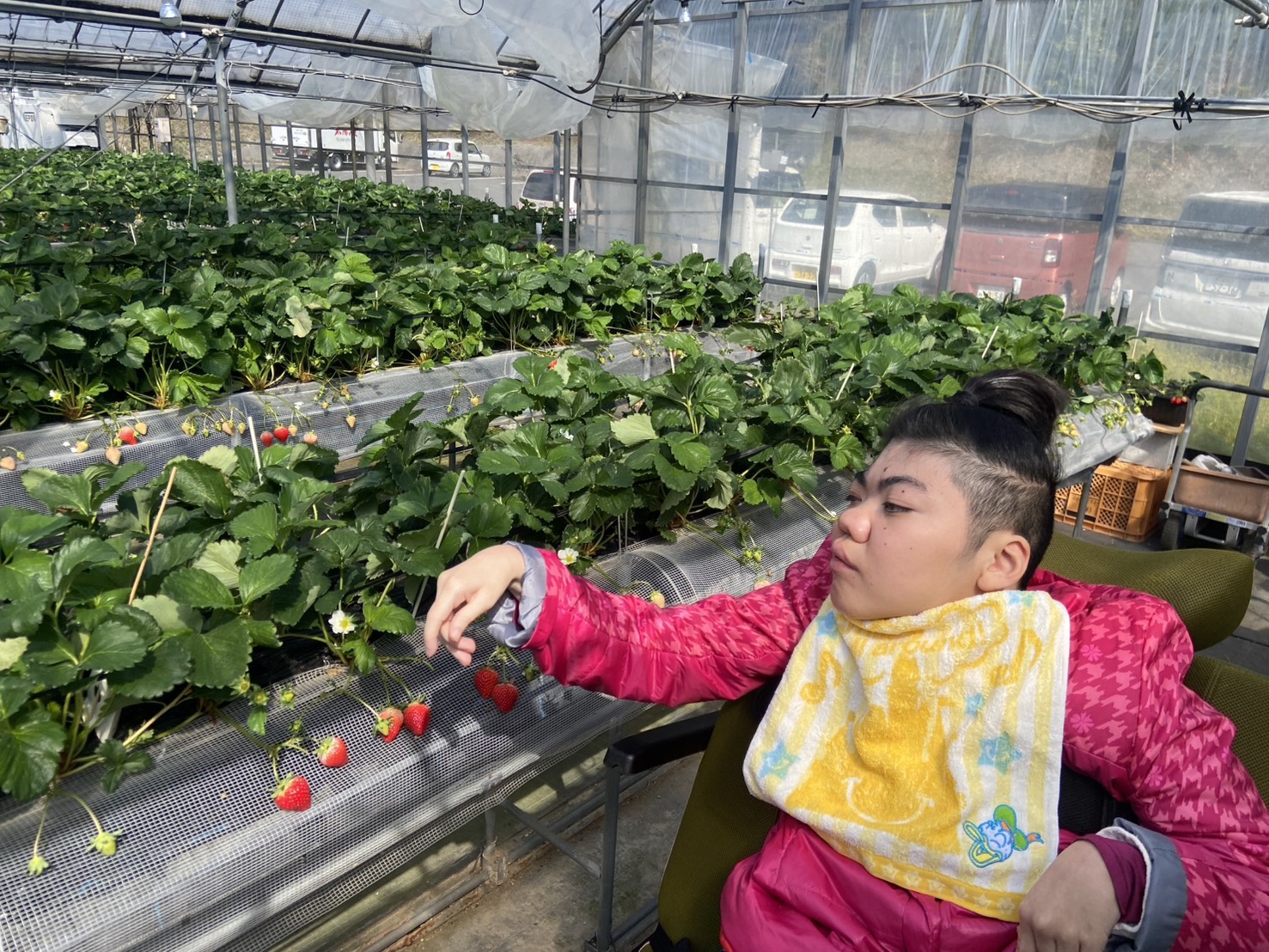 今日は3班目がいちご狩りへチェスト館に向かいました! 今日のいちご狩りをとても楽しみにされていたようです♪ 大振りで、とっても美味しそうないちごを取ることができました♪ 採れたてのいちごをはどんな感触でしょうか? 今回のいちご狩りも、美味しそうなイチゴをたくさん収穫することが出来ました! ご家族の方と一緒に美味しいイチゴを食べてくださいね♪ また次回、いちご狩りに参加される方も楽しみにしておいてくださいね!