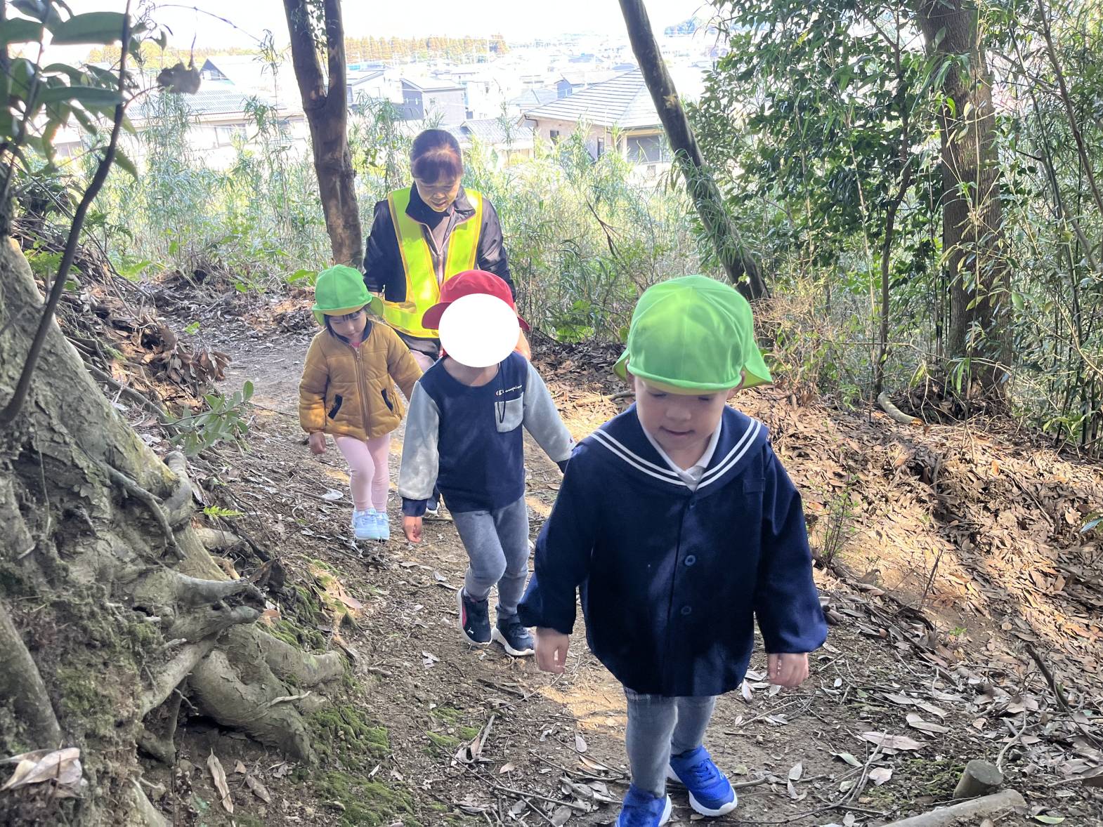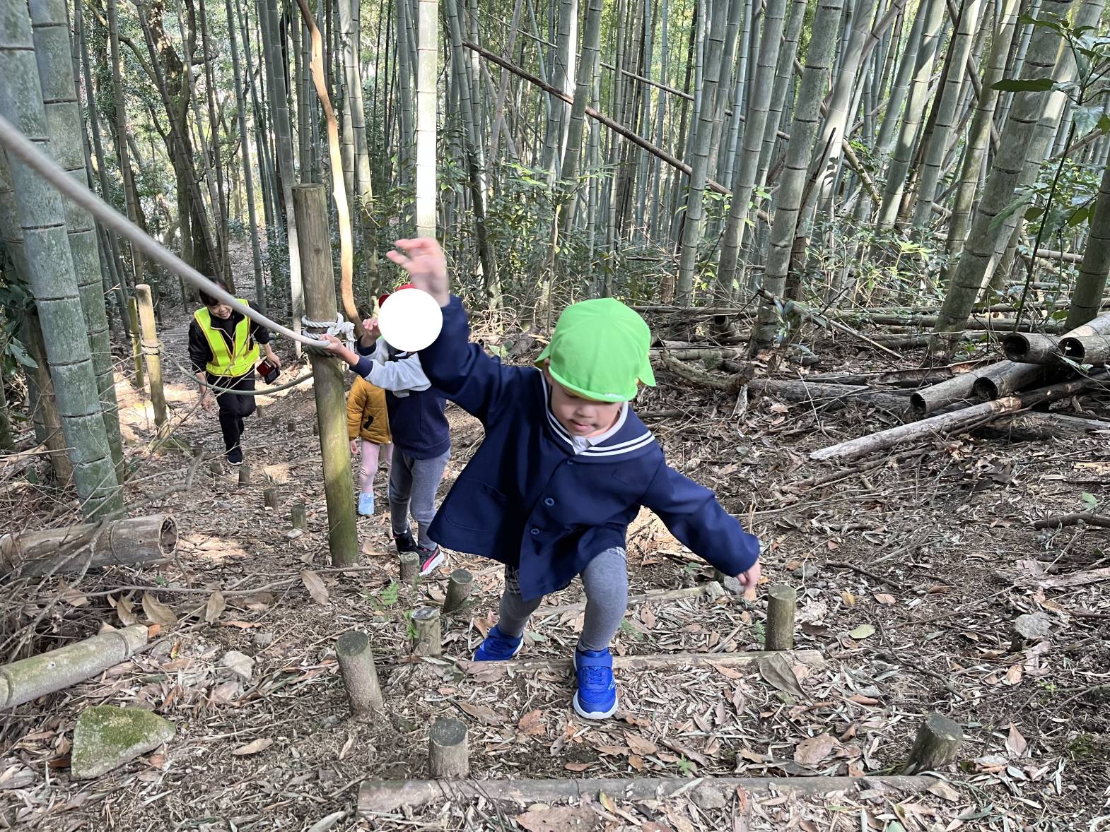 落ちているどんぐりやキノコを見たり、自然を感じたりしながら、足を大きく上げて登ることができました☆
