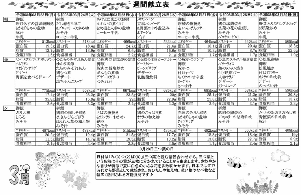 3月23日(月)~3月29日(日)の献立表になります。ぜひご覧ください。