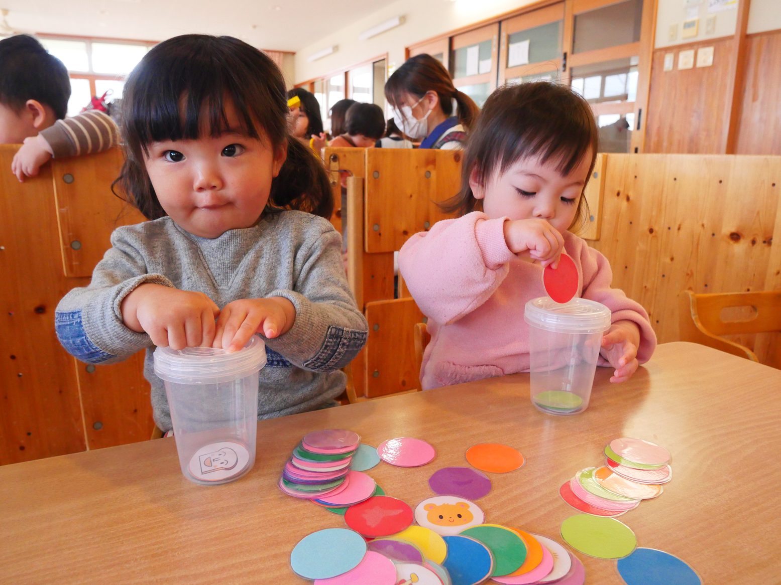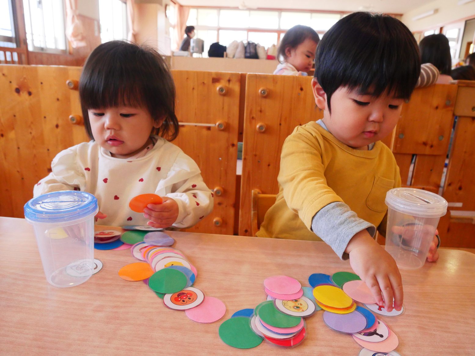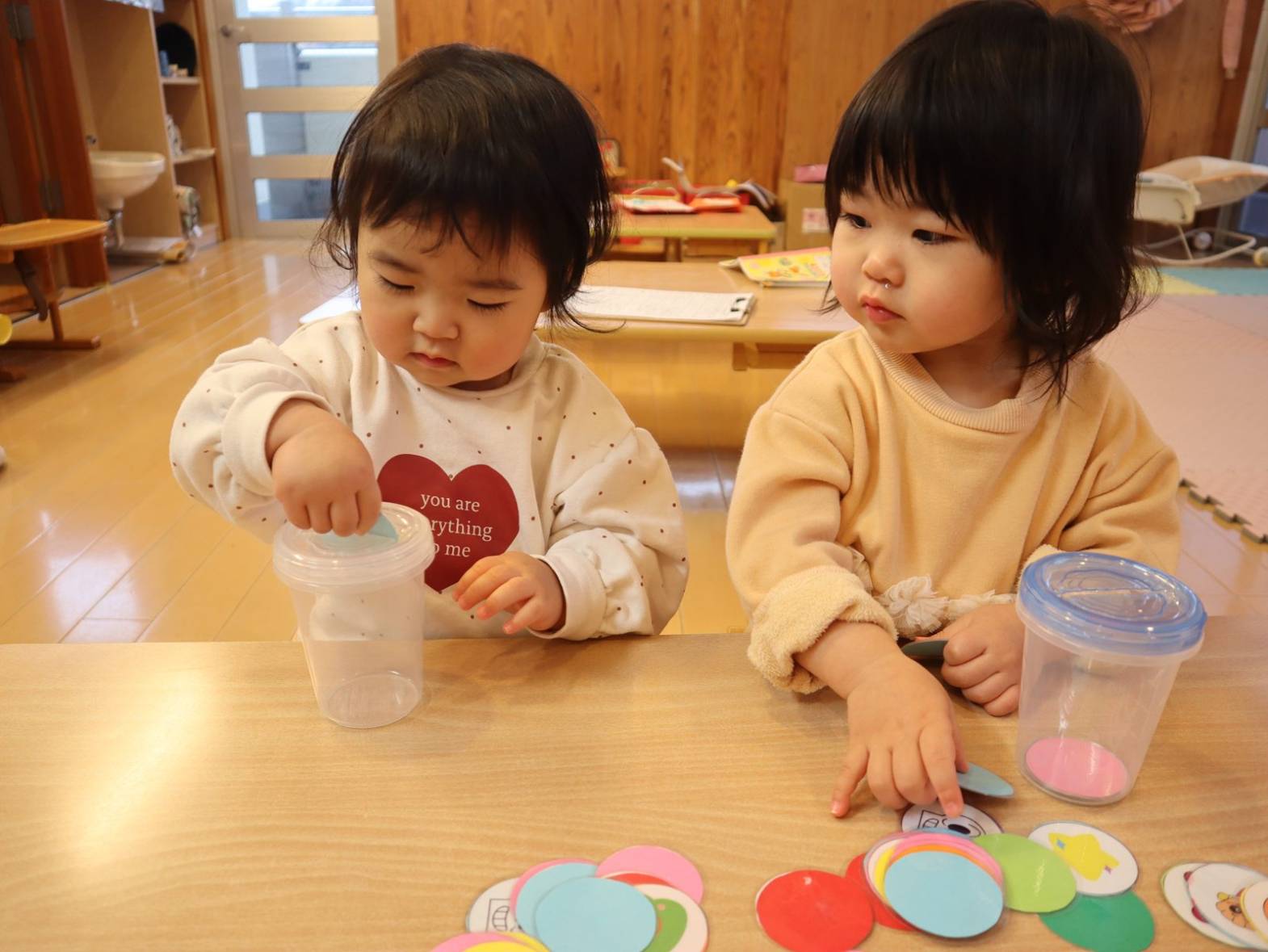 進級に向けて、机上での遊びに取り組み始めているひよこ組さんです。 現在はカード入れを集中して行う子どもたち。 一度始めると、夢中になって取り組みます。 カードのイラストには、子どもたちの好きなキャラクターが描かれていたり色が付いていたりしているので、「アンパンマン!」「あか!」と発語も見られています。 指先の力や集中力、発語力を高められるよう、今後も取り組んでいきたいと思います !