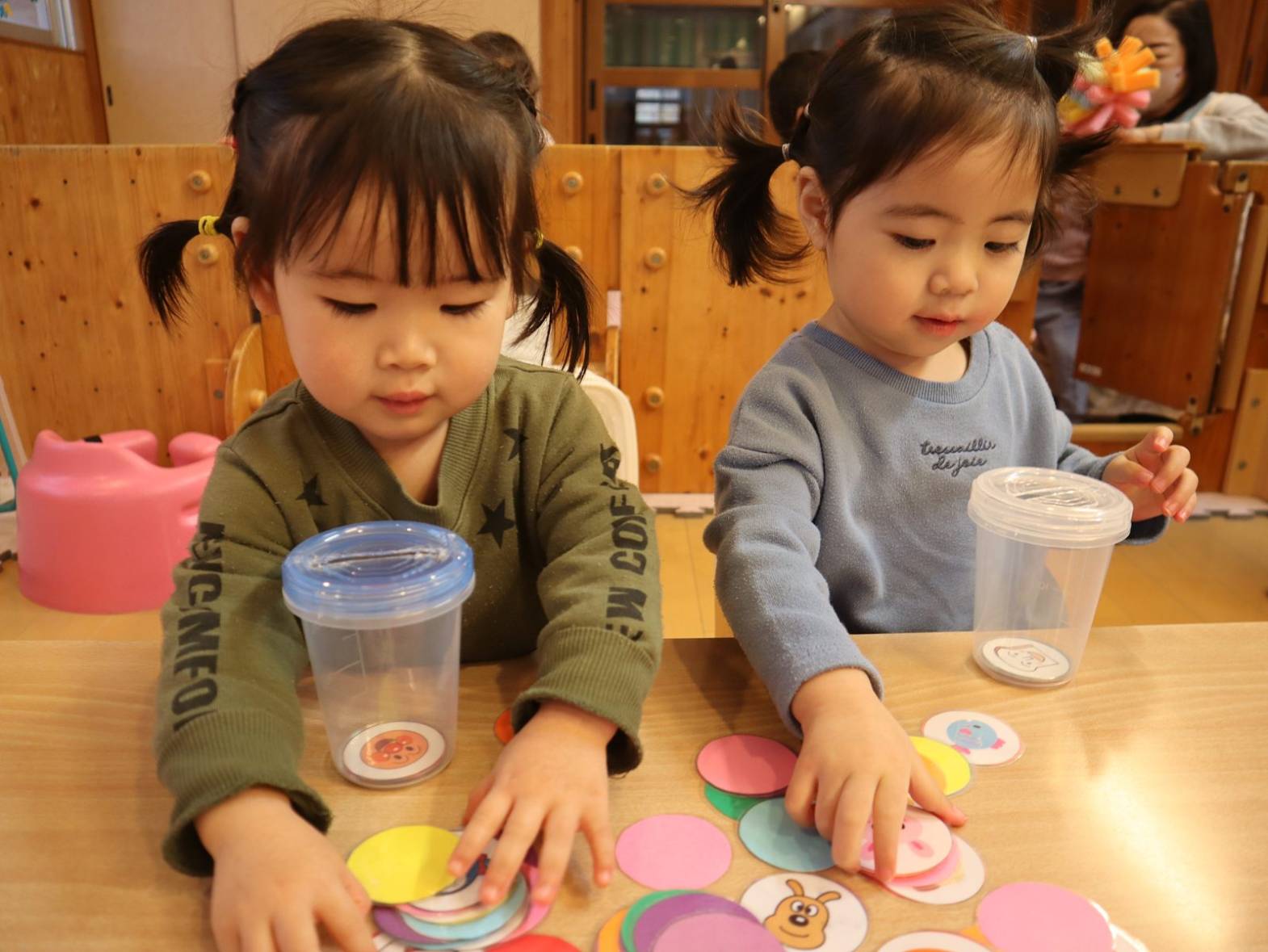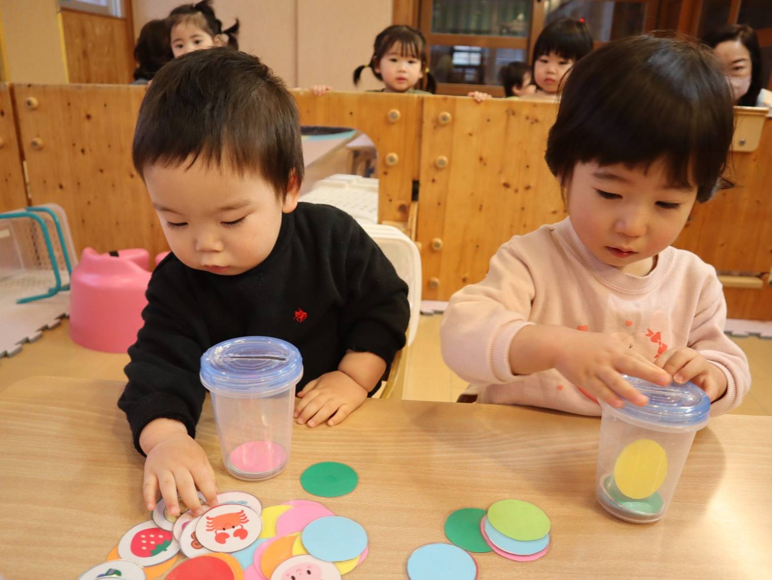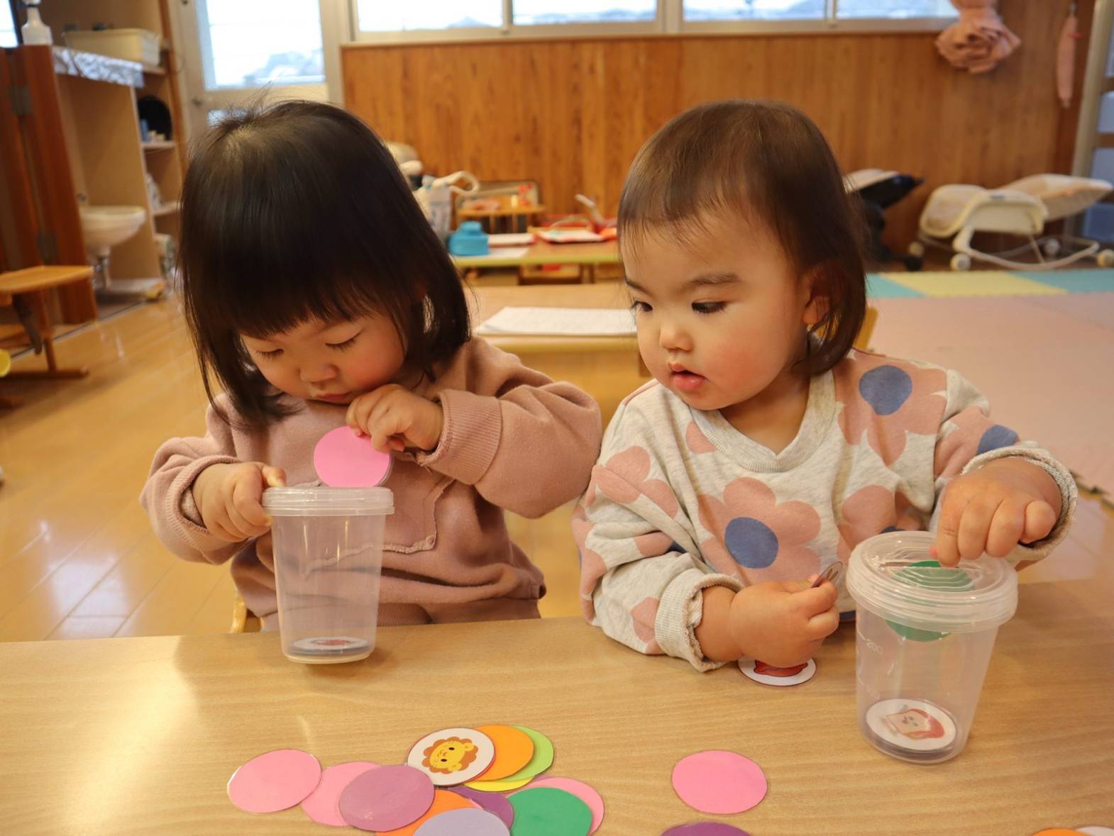 進級に向けて、机上での遊びに取り組み始めているひよこ組さんです。 現在はカード入れを集中して行う子どもたち。 一度始めると、夢中になって取り組みます。 カードのイラストには、子どもたちの好きなキャラクターが描かれていたり色が付いていたりしているので、「アンパンマン!」「あか!」と発語も見られています。 指先の力や集中力、発語力を高められるよう、今後も取り組んでいきたいと思います !