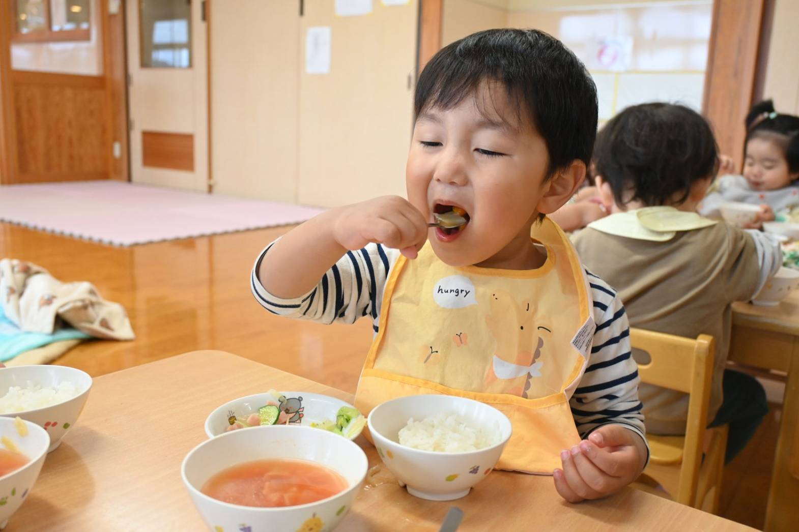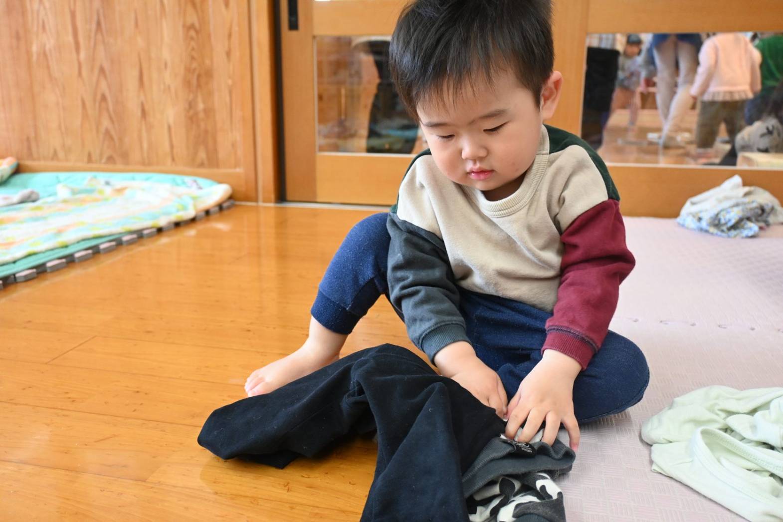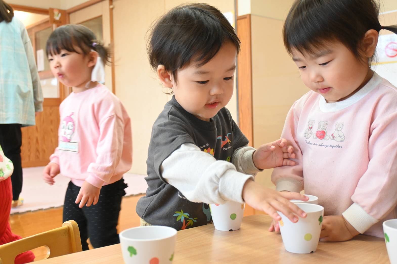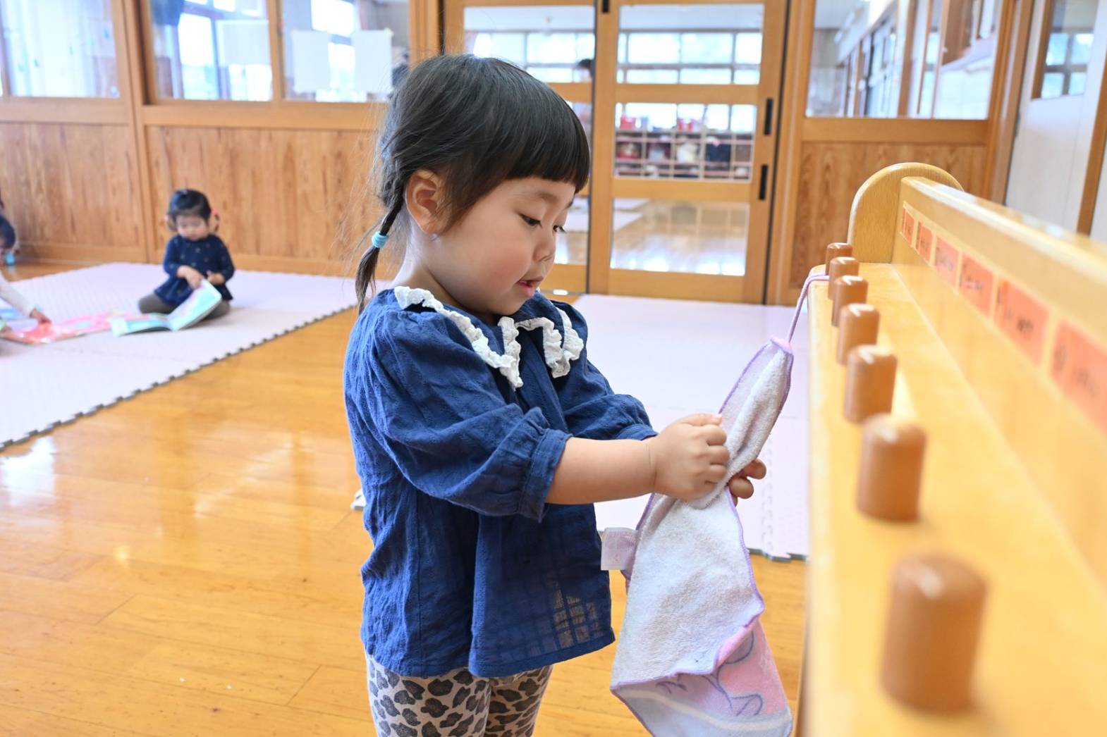 初めは戸惑う姿もありましたが、「こうするの?」、「ここでいい?」と保育者に聞きながら、着替えや給食など身の回りのことに意欲的に取り組む姿が見られています。